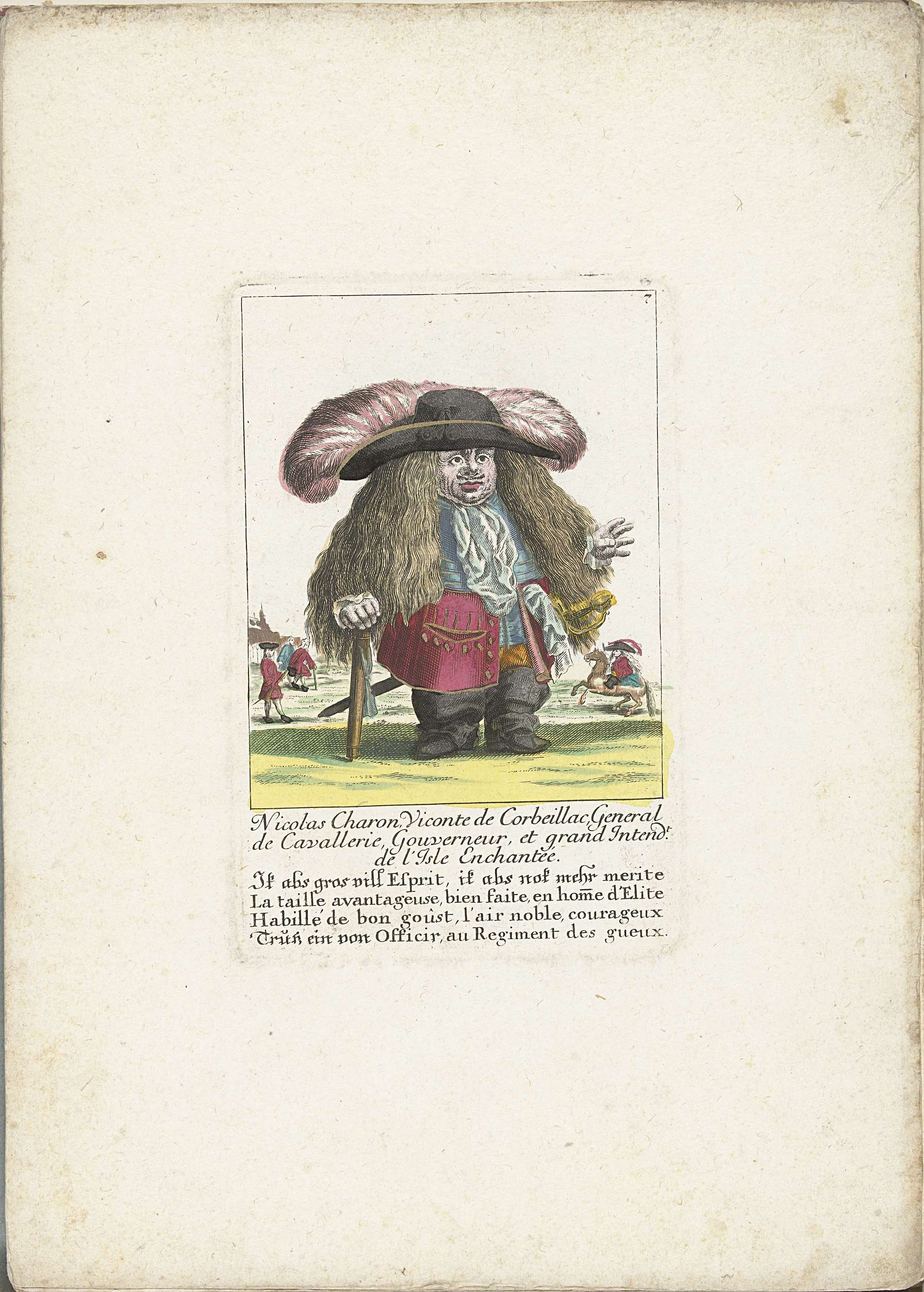 De kleine mens Nicolas Charon als een generaal van de cavalerie. In het onderschrift onder de titel een vierregelig vers in het Duits. Genummerd rechtsboven: 7. Onderdeel van een losbladige uitgave uit ca. 1710 van een serie karikaturen van kleine mensen, bekend als Het Dwergentooneel.