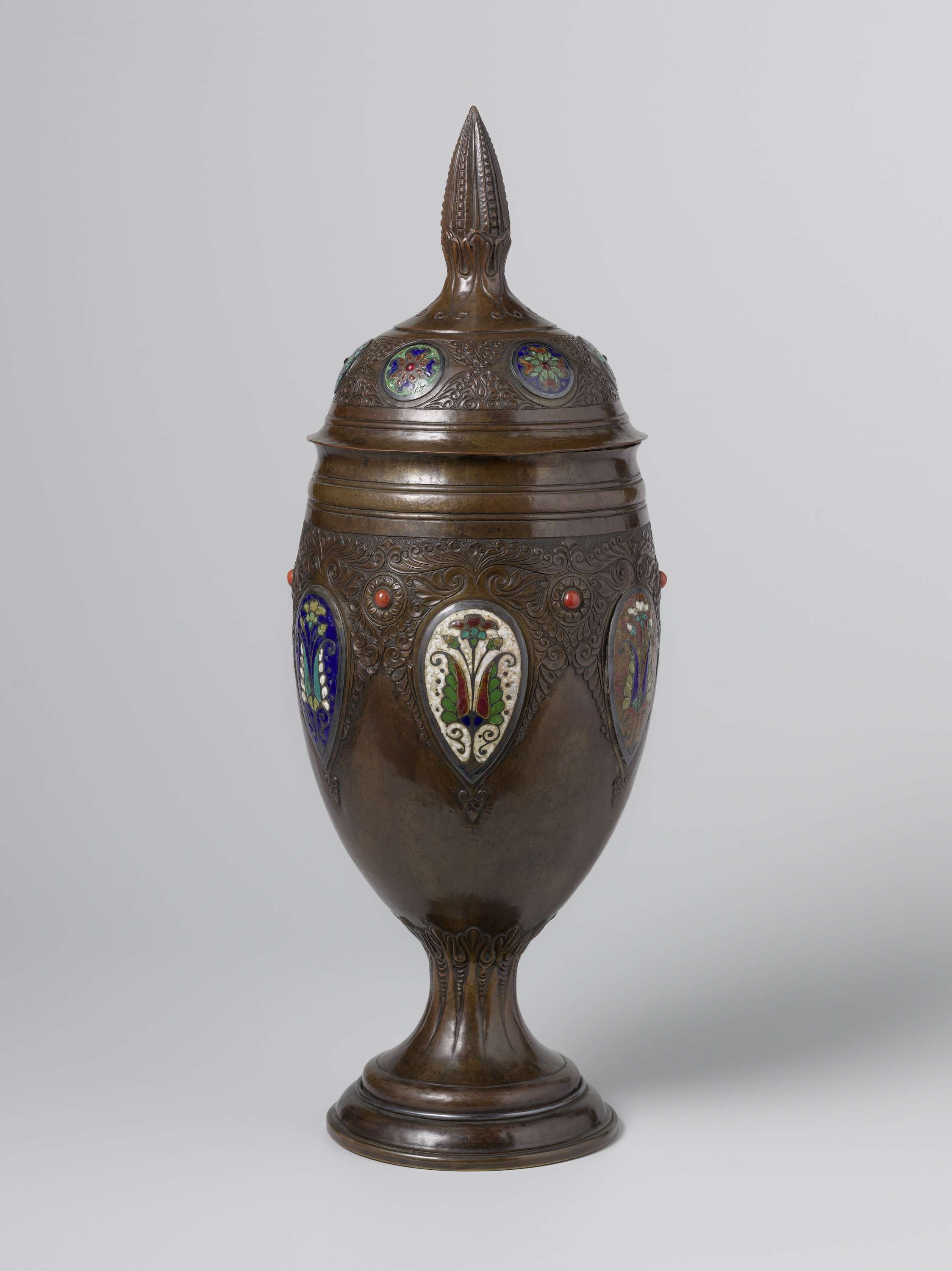 Het ronde voorwerp bestaat uit een bokaal, die met de bodem in de voet uit één tombakplaat is geslagen, en een deksel. Onder de voetbodem is met twee bouten een uit tombak geslagen geprofileerde opstaande rand gemonteerd. Op bokaal en deksel zijn telkens zes geëmailleerde zilveren schilden gesoldeerd. De bokaal is aan de onderkant in ...