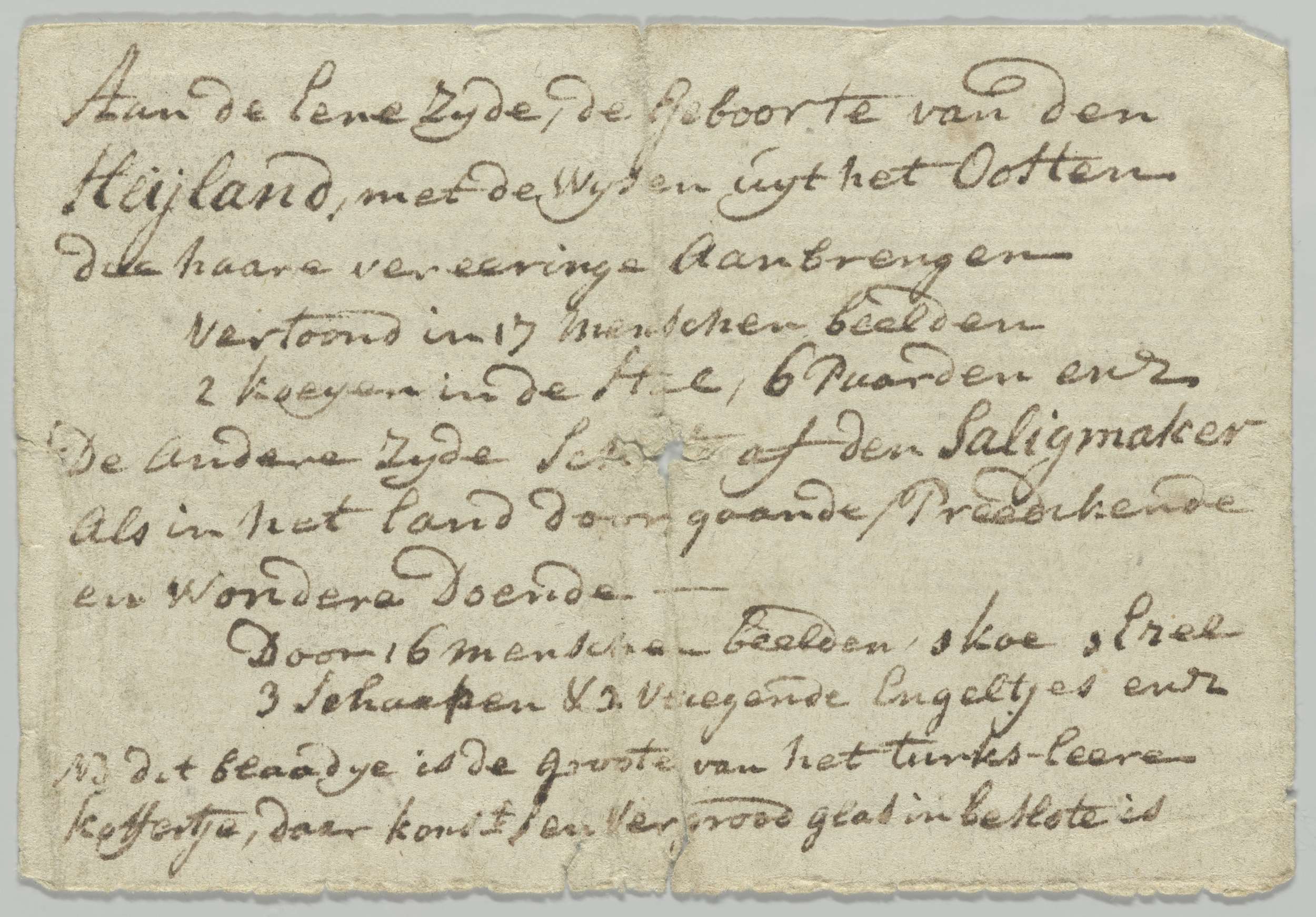 Handgeschreven beschrijving die vertelt hoe klein de noot is en wat erin te zien is.