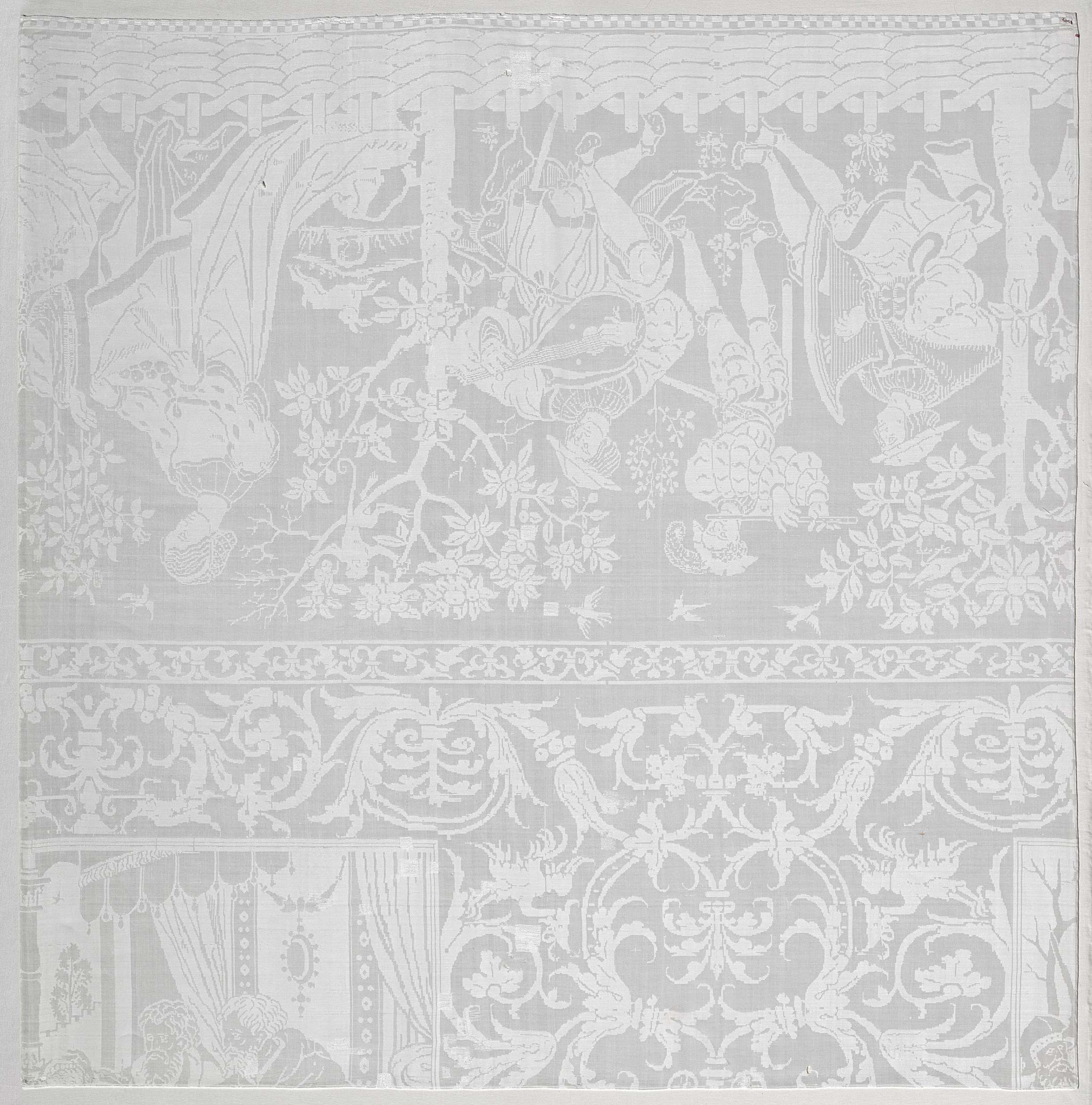 Fragment van een tafellaken van linnendamast met voorstelling: geschiedenis van Susanna; rand met muzikanten en vrouwen