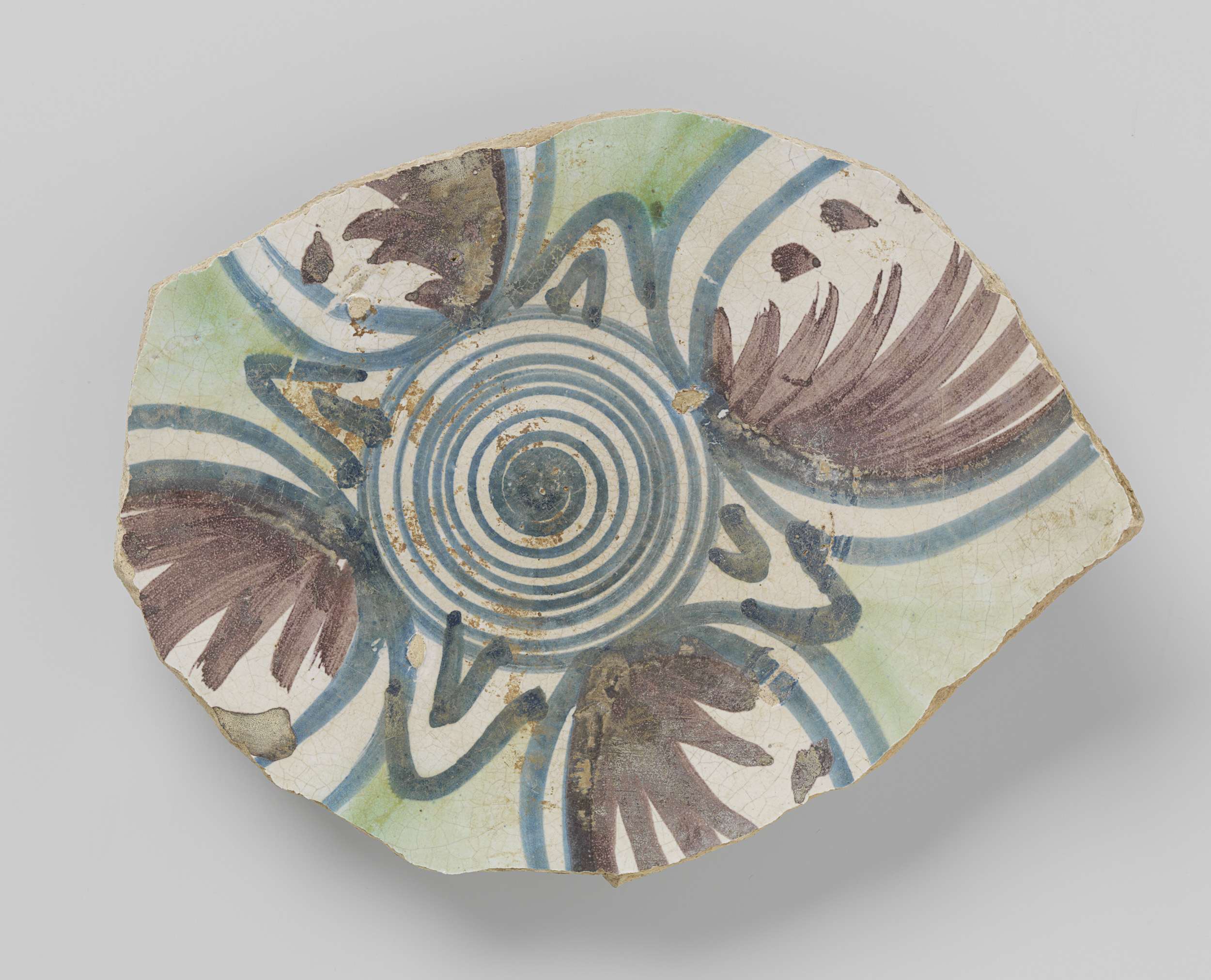 Fragment van een schotel van aardewerk, aan de bovenzijde met tinglazuur, aan de achterzijde met loodglazuur gedekt, versierd met geometrische ornamenten in blauw, paars en groen. Opgegraven in Londen, Middlesex Street.