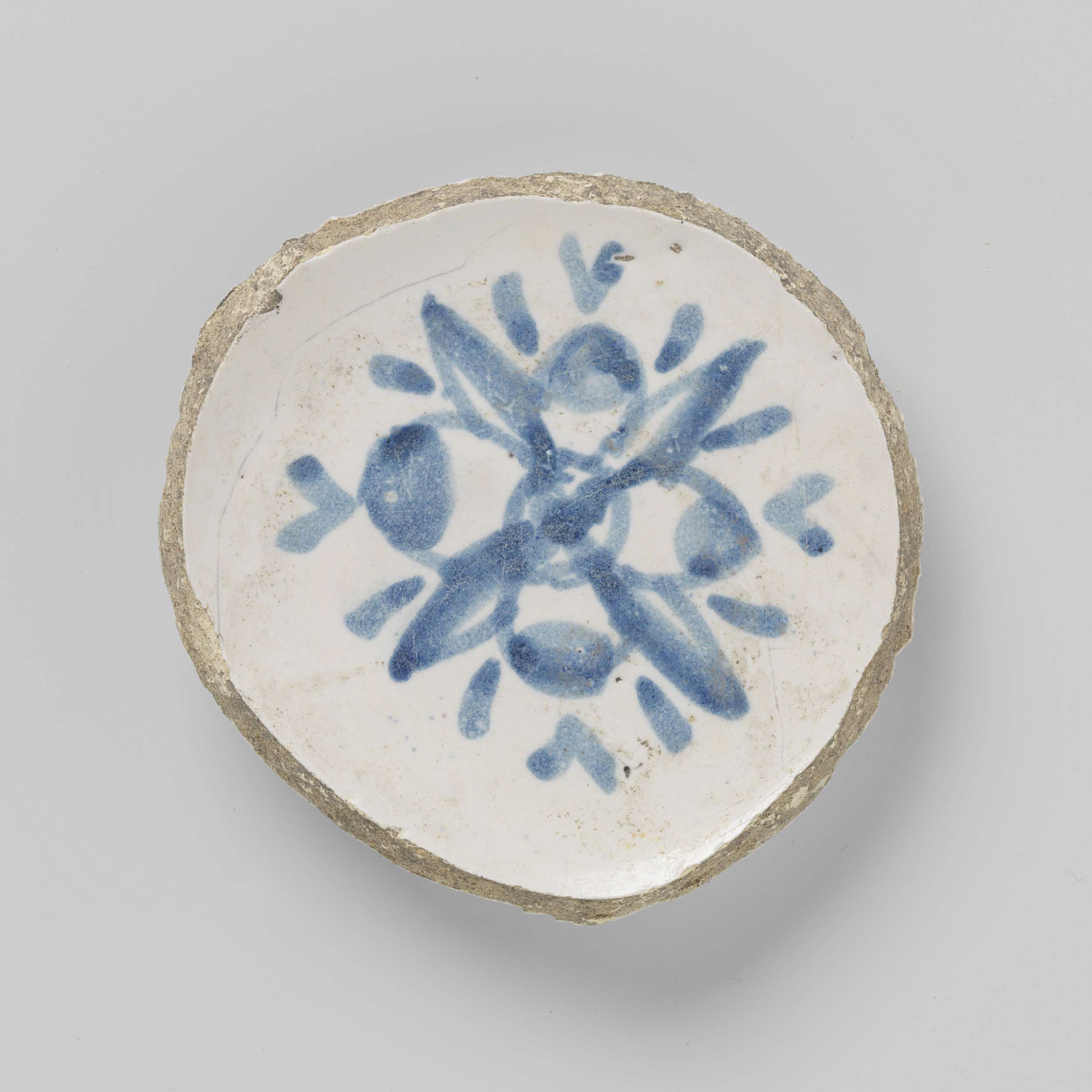 Fragment van blauw beschilderde faience. Op het fragment is een geometrisch ornament geschilderd. Opgegraven in Londen.