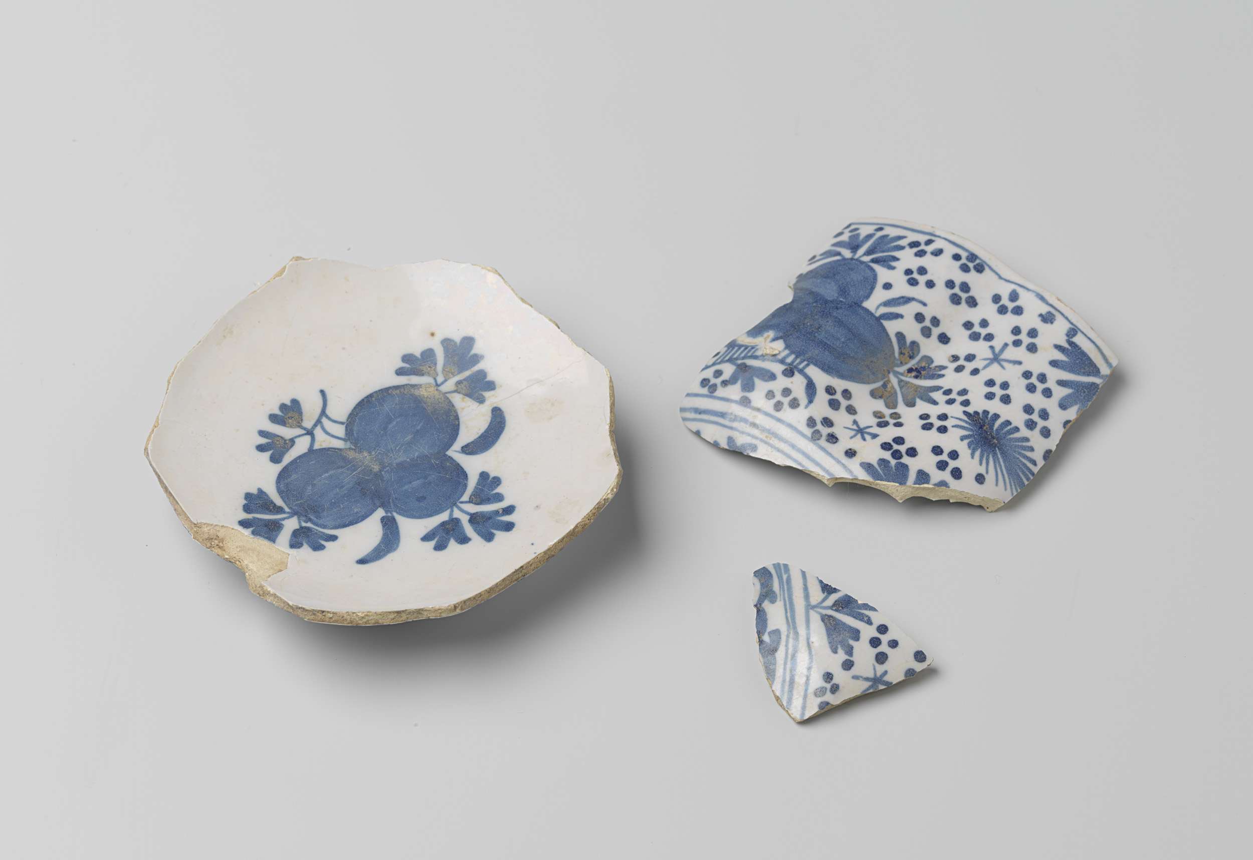 Scherf van aardewerk, geheel bedekt met tinglazuur en versierd met blauwe ornamenten op witte grond. Gemerkt: W. Opgegraven in Londen, Middlesex Street dichtbij Liverpool Street Station.