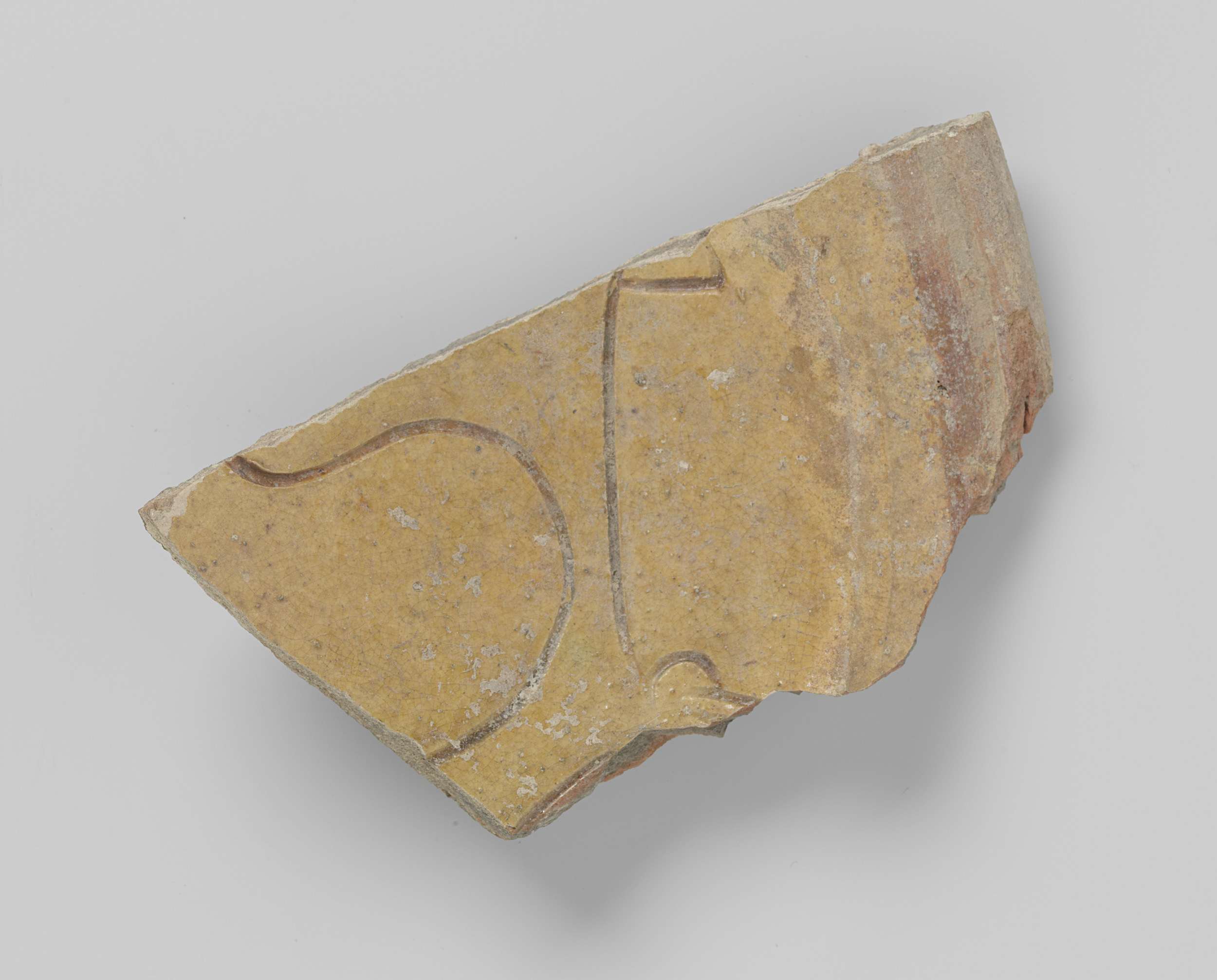 Scherf van rode klei met witte sliblaag in loodglazuur, waarin een ornament gekrast. Gevonden in Londen, Middlesex Street dichtbij Liverpool Street Station.
