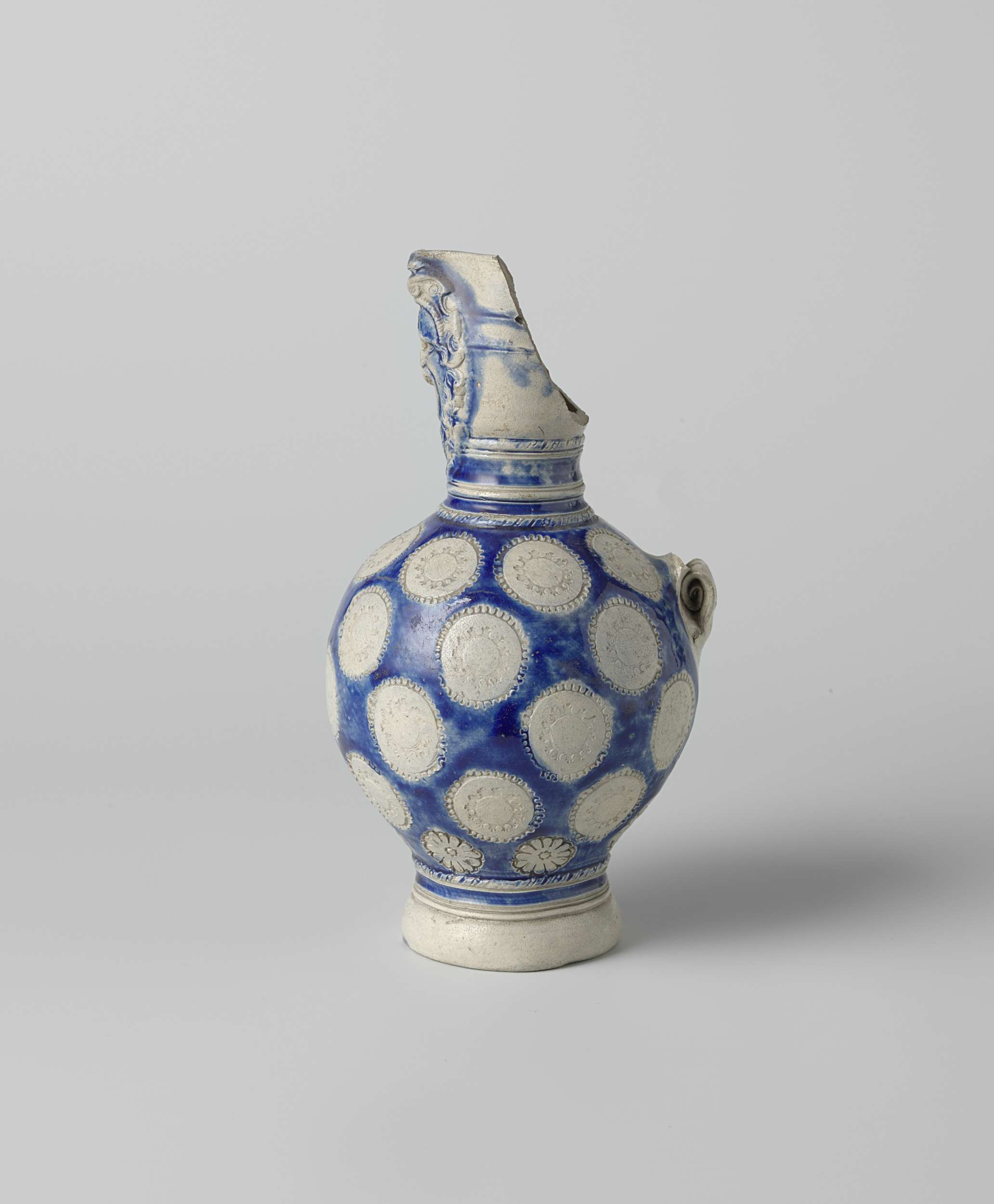 Fragment van een kan van steengoed op hoge voet met een bolvormig lichaam en smalle nek met geknepen tuit. Een deel van de nek en het oor ontbreken. Profielen op de nek en voet. Gedeeltelijk bedekt met kobaltblauw. Op de buik vier rijen van gestempelde medaillons en één rij van gestempelde rozetten. In reliëf op ...