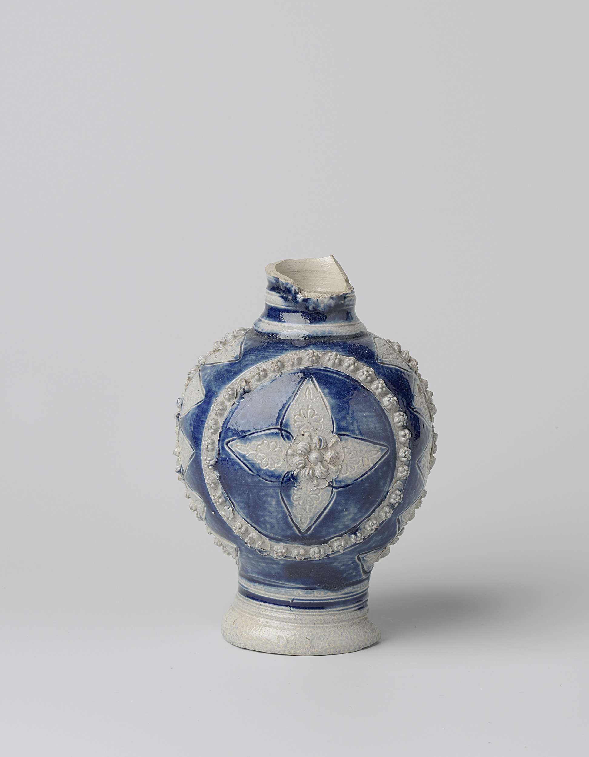 Fragment van een kruik van steengoed op hoge voet (gebroken) met een bolvormig lichaam en smalle nek. Het bovenste deel van de nek en het oor ontbreken. Gedeeltelijk bedekt met kobaltblauw. Op de voorzijde van de buik een medaillon in reliëf gevormd door een gedrukte en opgelegde band van kleine bloemen met daarin een grotere ...