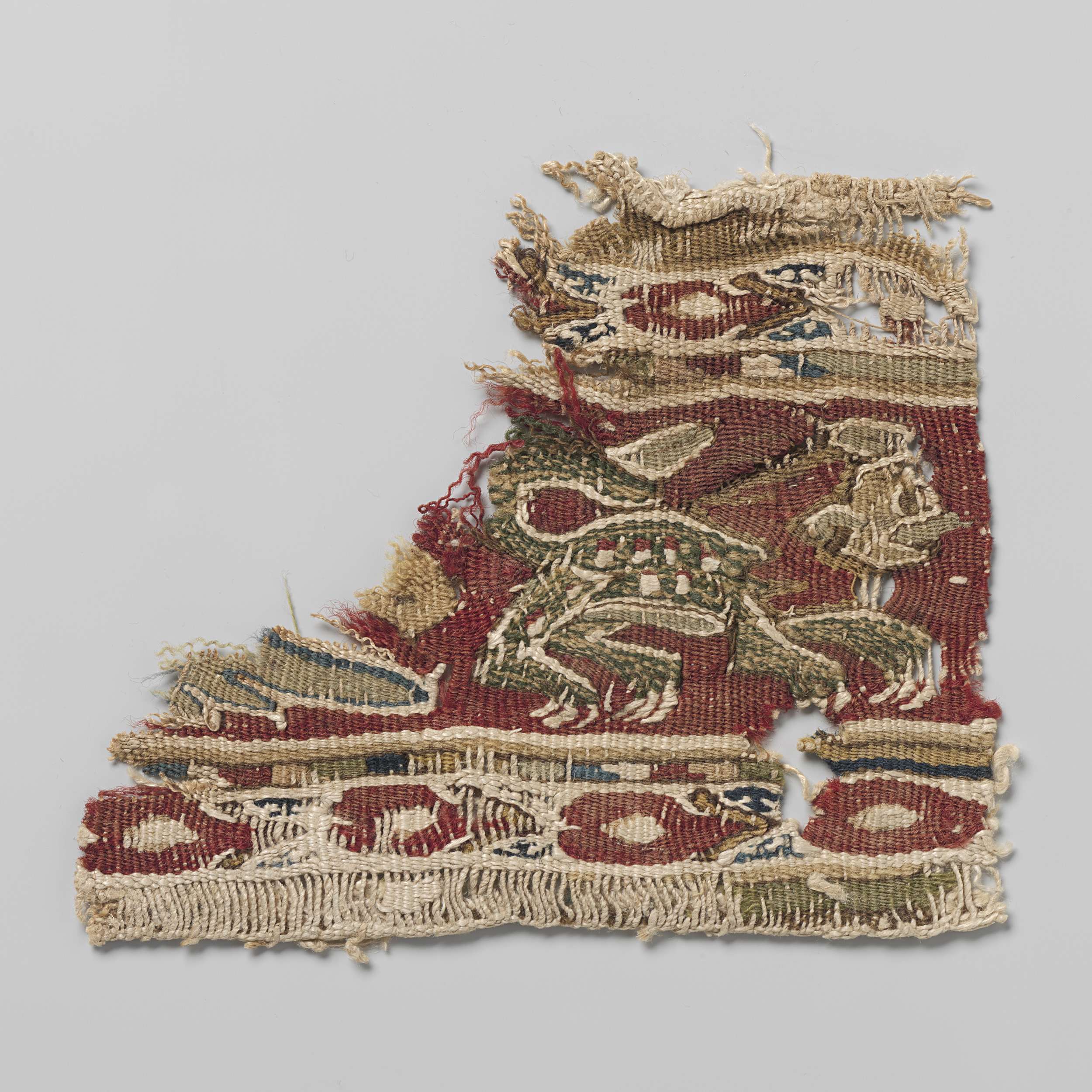 Veelkleurig weefselfragment met centraal op een rode grond een viervoeter met opgeheven staart en klauwen in groen, geel, rood en naturel. Boven en onder lijnen en decoratieve boorden in rood, groen, geel, licht- en donkerblauw.
