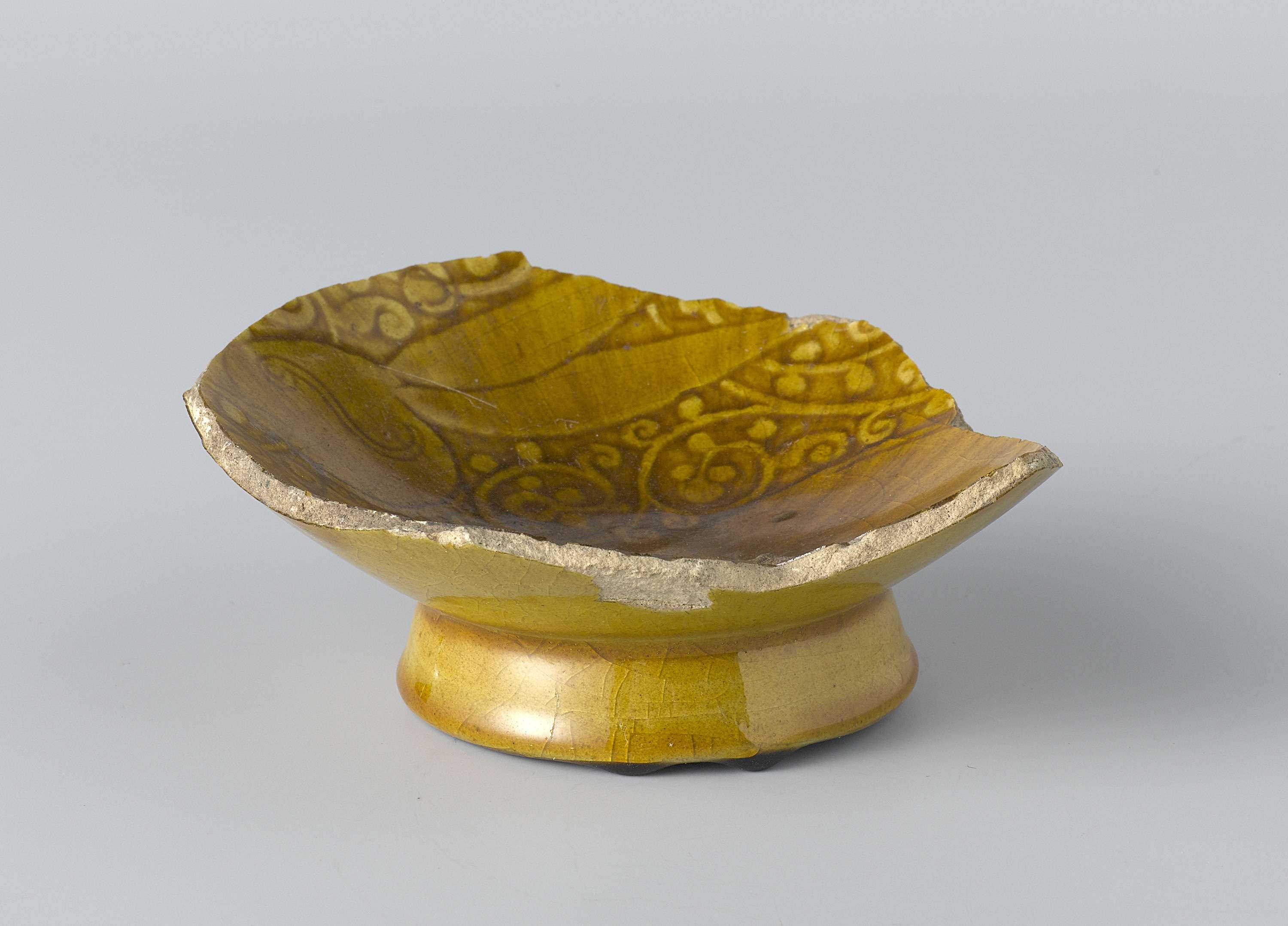 Fragment van een kom van kwarts-fritgoed met ingegrifte bloemranken on een transparant geel lood-alkaliglazuur.