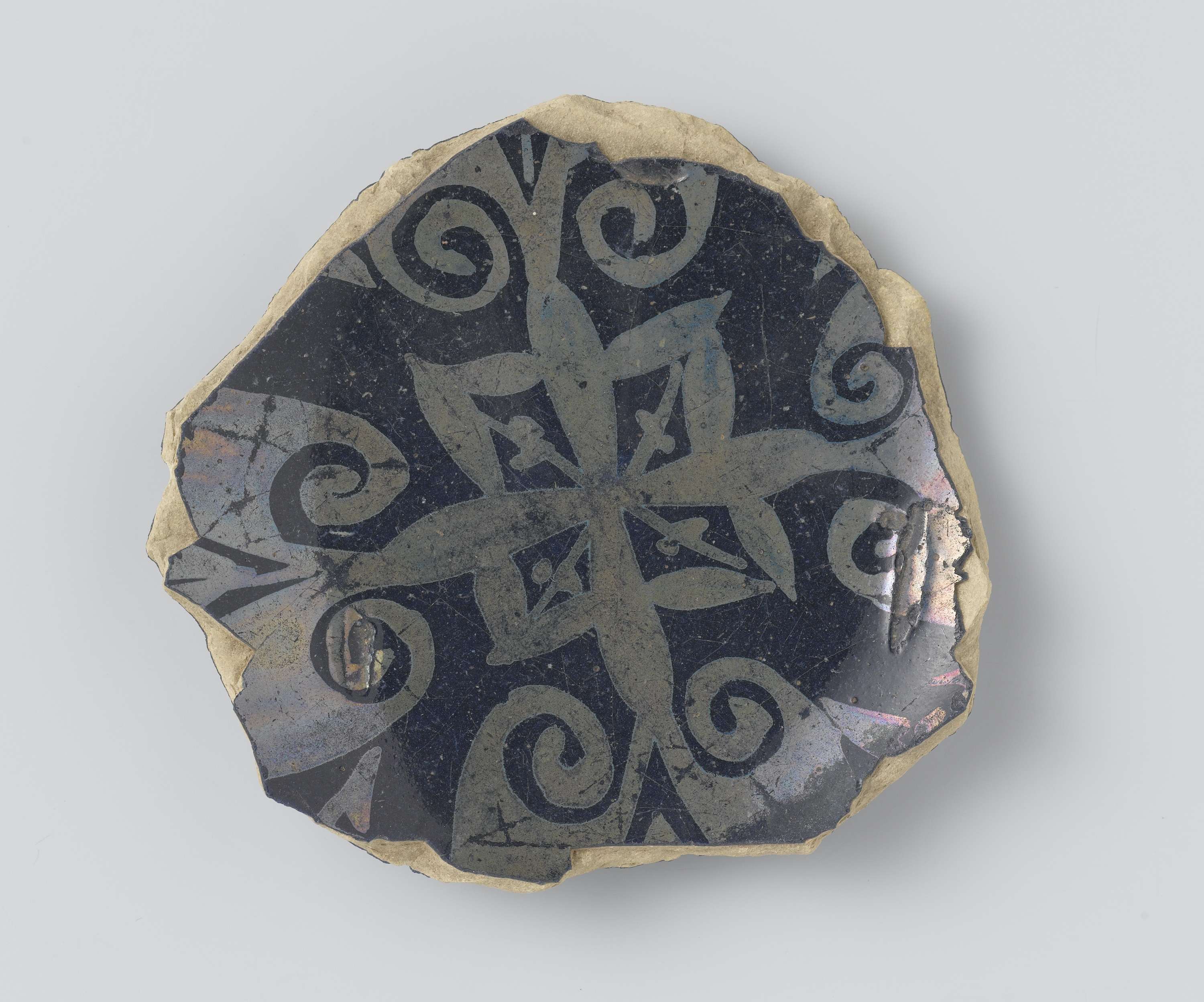 Fragment van de bodem van een kom, met een dik lapisblauw glazuur en met symmetrisch ornament van lelievormige bloemranken. De buitenkant eveneens blauw geglazuurd. Vertoont in het midden van de bodem een Arabisch letterteken(?). Grijsgele aarde. Het fragment is gevonden te Cairo.