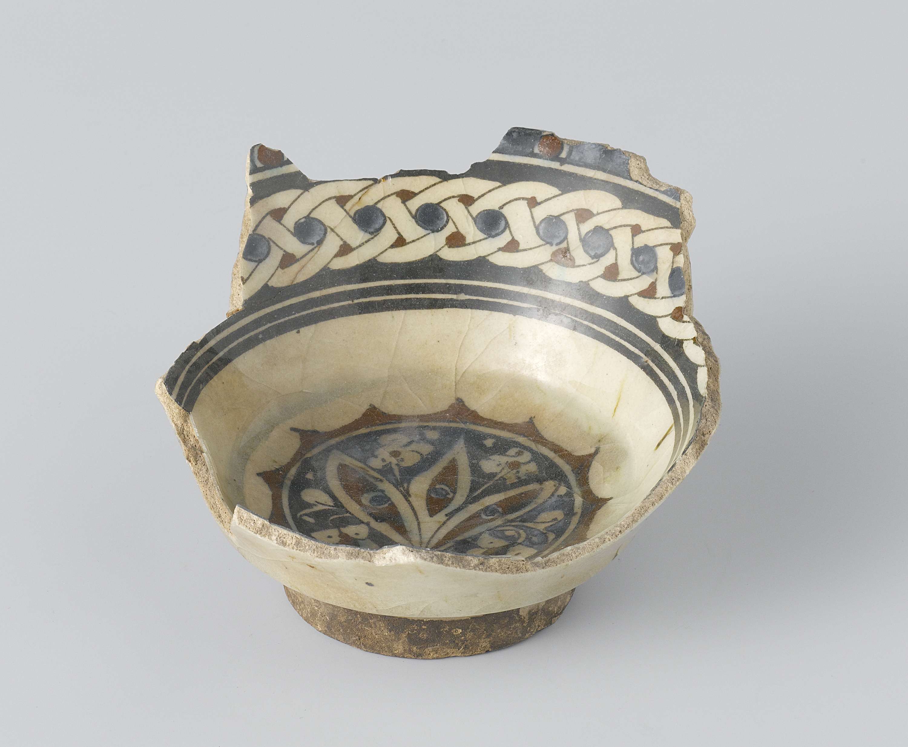 Fragment van een kom van kwarts-fritgoed. Grijsgele scherf op een witte engobe. Op de bodem een bloeiende plant in een medaillon in rood en blauw, met zwarte omtrekken zijn geschilderd. Op de binnenwand een band met vlechtwerk in dezelfde kleuren. Buiten een dessin van ovale in elkaar grijpende zwarte lijnen langs de blauwe rand. De ...
