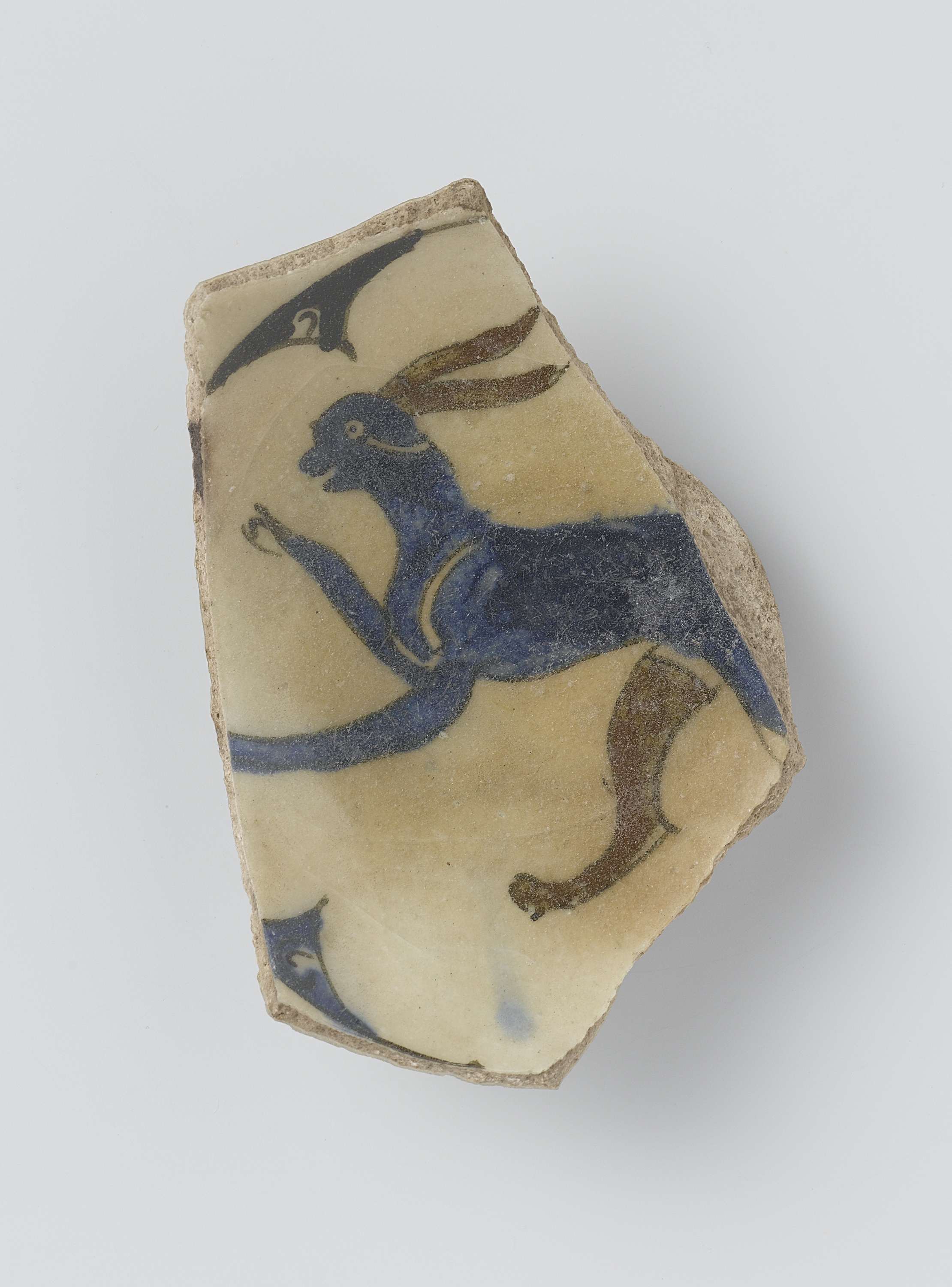 Fragment van de bodem van een kleine bak van kwarts-fritgoed. In het midden een haas in blauw en bruin binnen een gekartelde omlijsting. Grijsgele aarde. De voet ongeglazuurd. Het fragment is gevonden te Cairo.