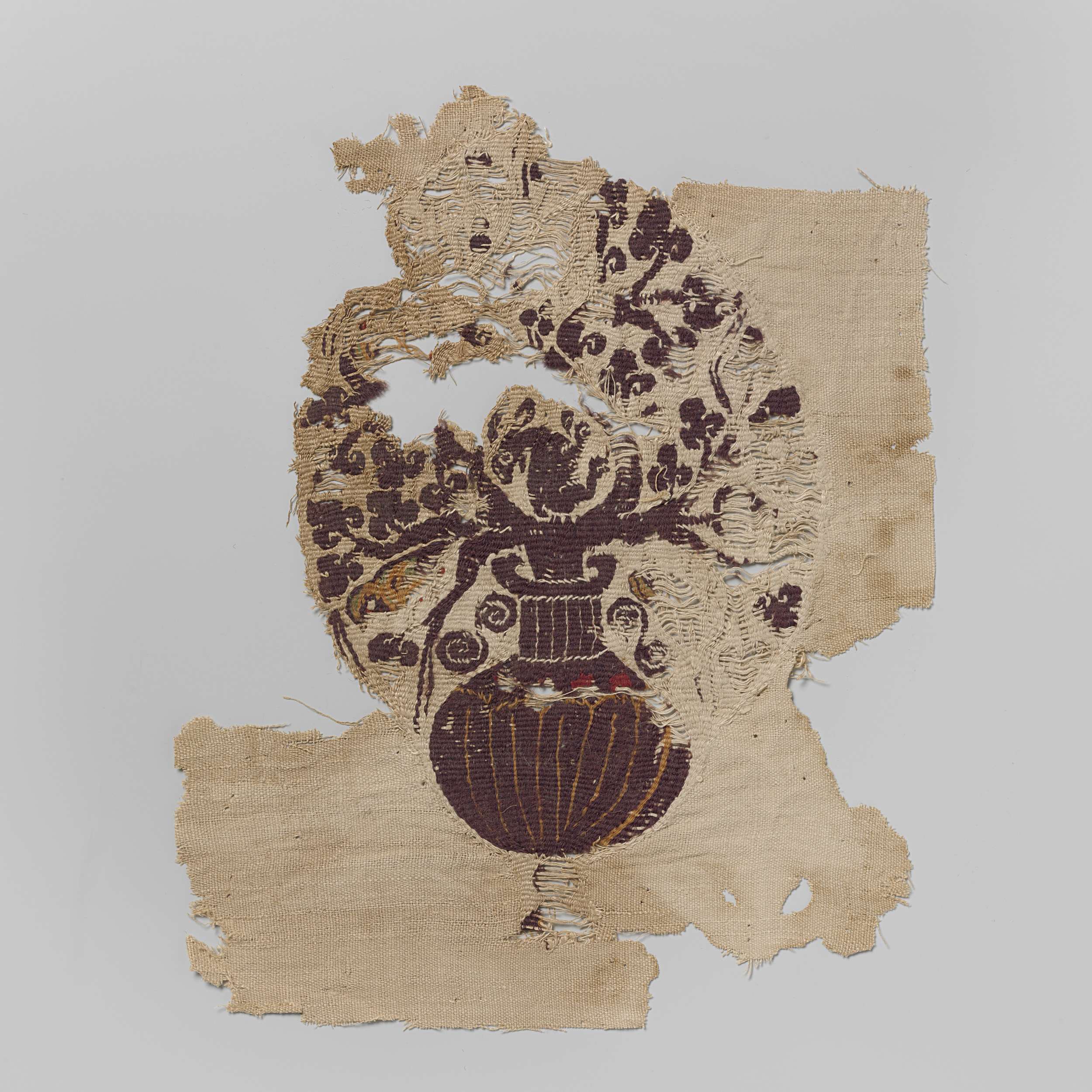 Naturelkleurig linnen weefselfragment met ingeweven ovaal motief met een vaas in purper, waaruit bladranken komen met centraal een omkijkende haas. Linksonder en elders fragmenten van vogels in oranje, groen en rood.