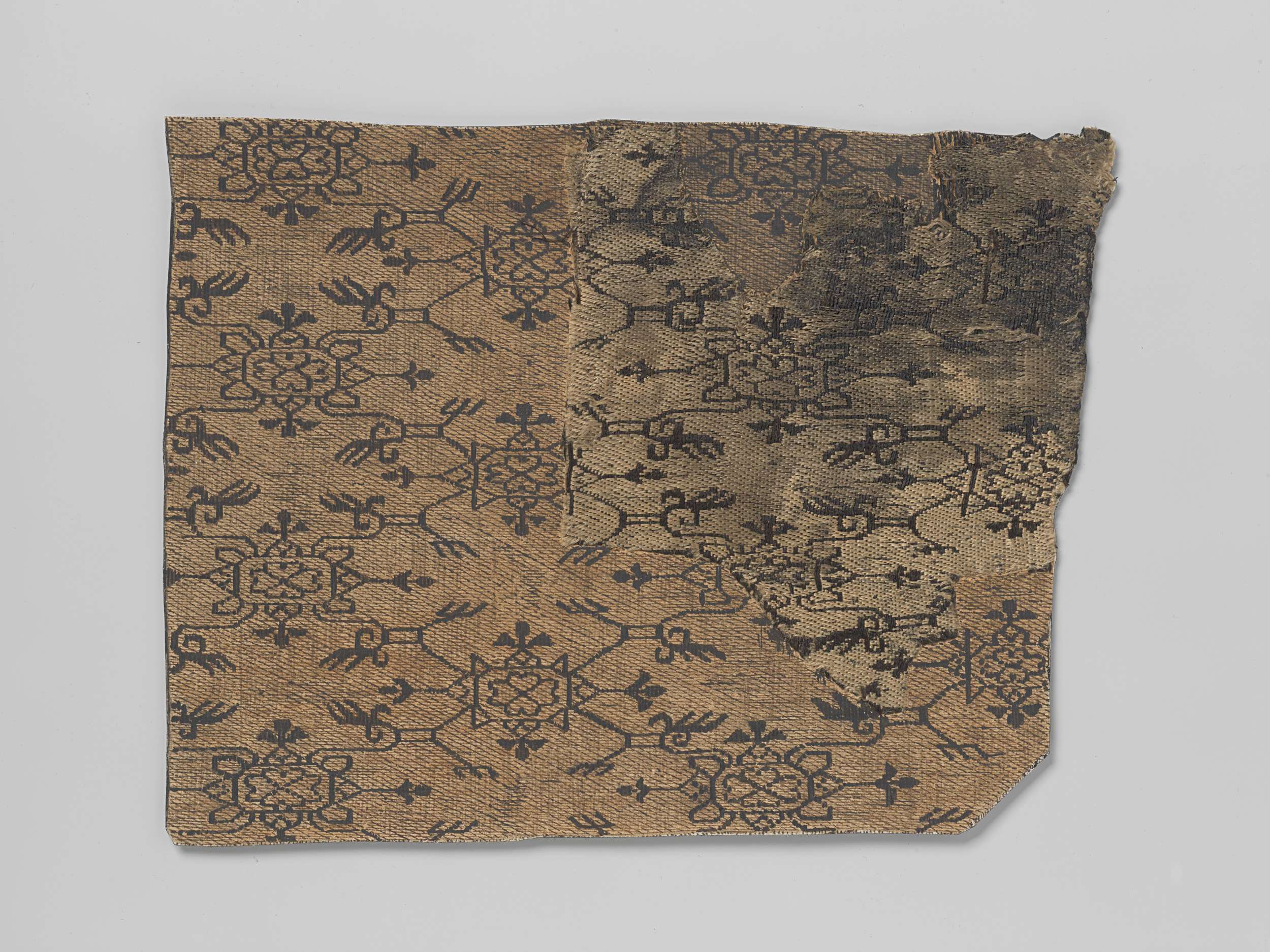 Op karton opgekleefd en bijgetekend weefselfragment, zodat het hele patroon zichtbaar wordt. Goudkleurige grond met zwarte lijntekening, die vierkanten, slingers, gestileerde bloemen- en bladmotieven vormen