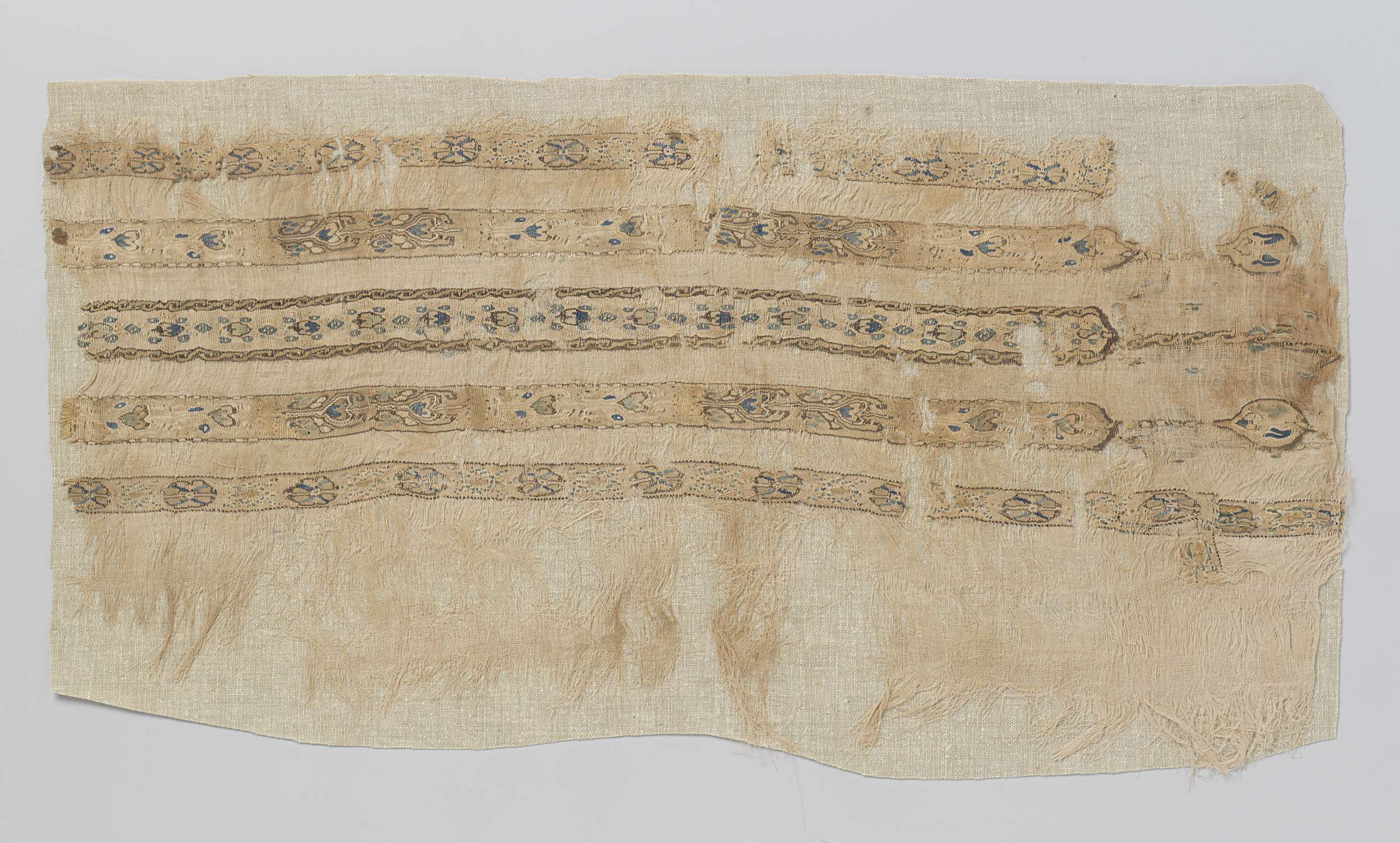 Naturelkleurig linnen weefselfragment met ingeweven zijden versiering in tapisserietechniek van vijf banden waarbinnen verschillende motieven. De middelste band heeft kleine bladmotieven in donkerblauw, lichtblauw en geel met bruine omlijning, met daar rond een stippelmotief in blauw. De smalle omranding komt onderaan samen en eindigt in een druppelmotief. De banden links en rechts hiervan, in dezelfde ...