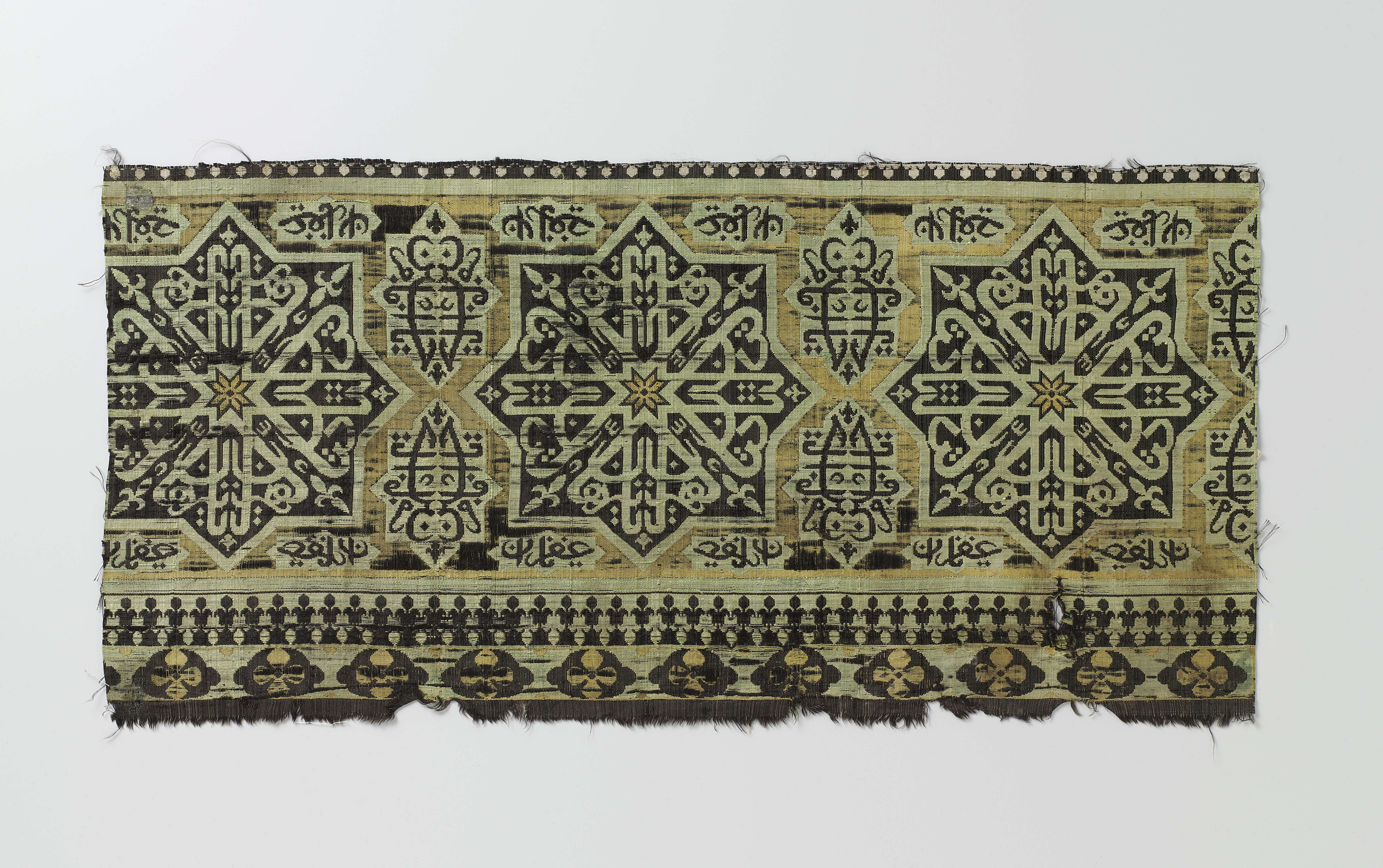 Fragment van een weefsel van zijde met zwarte kettingdraden en met zwarte, groene en gele inslagdraden die een randornament vormen van naast elkaar op gele grond geplaatste zwarte, met groen omlijnde 16-hoeken. Hierin een stervormig ornament van zich kruisende kuffische lettertekens en een gele ster als hartversiering. Langs de zijden van de 16-hoeken zijn kleine ...