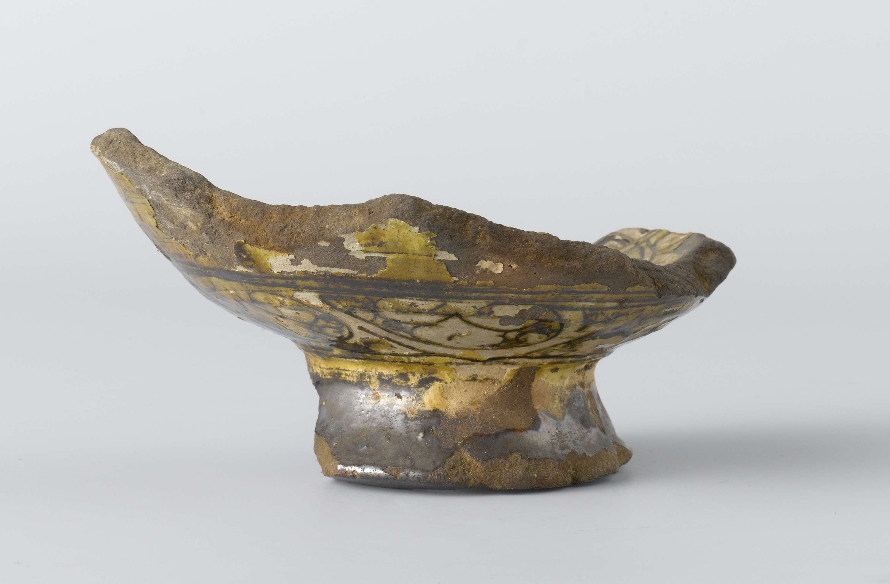 Fragment van de bodem en wand van een schotel van aardewerk. Zachte bruine aarde met gele glazuur versierd met een ingegrifte band met bloemranken. In twee stukken gebroken.
