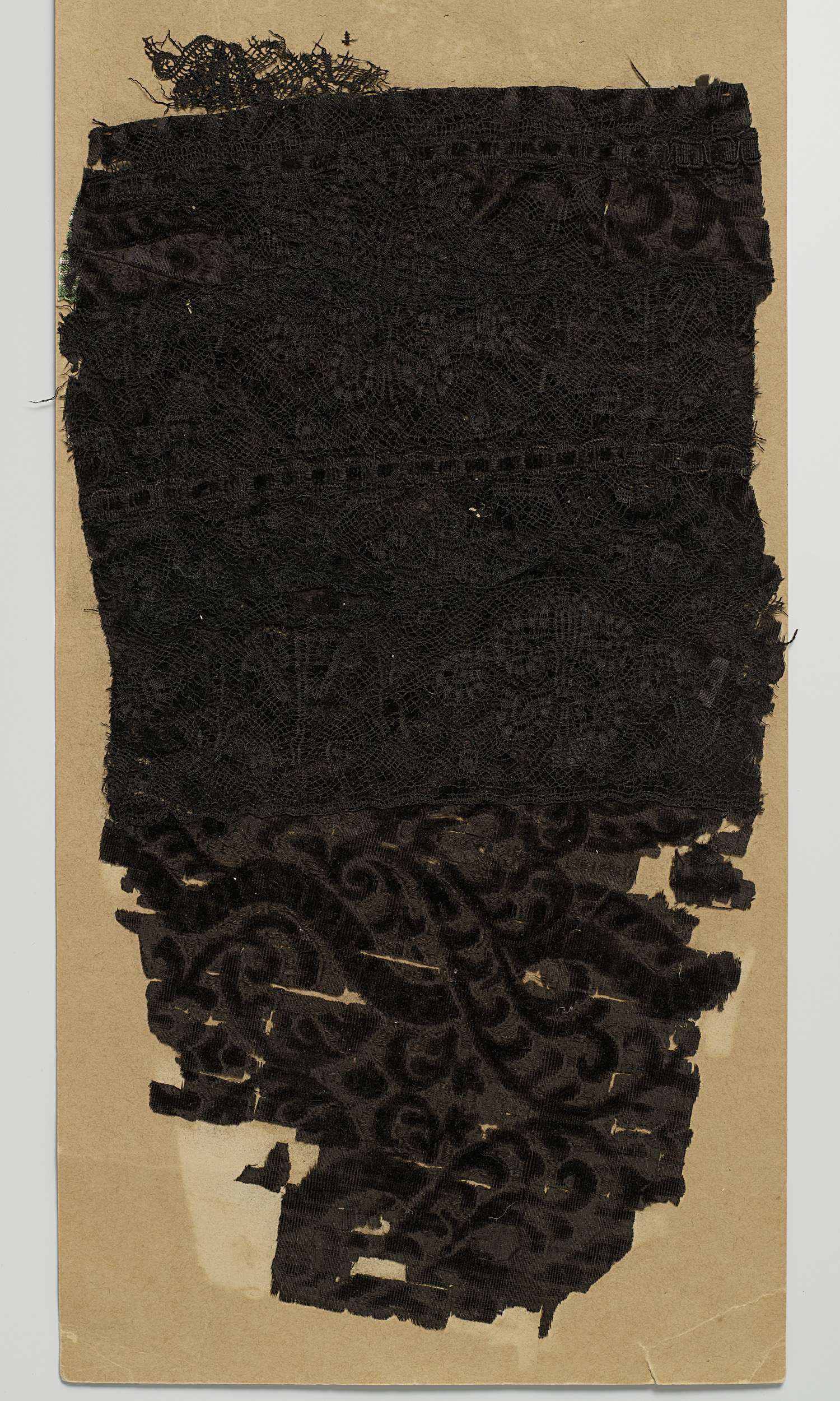 Fragment van een mantel van zwarte ciseléfluweel waarop zwarte kloskant is genaaid. Het fragment is volgens overlevering afkomstig van een mantel van Hugo de Groot.