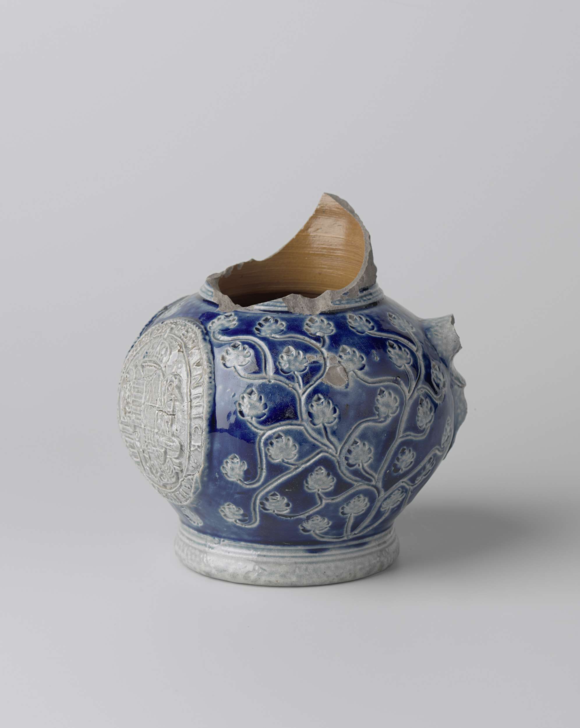 Fragment van een kruik van steengoed op standring met een bolvormig lichaam. Nek en oor zijn afgebroken. Gedeeltelijk bedekt met kobaltblauw. Op de buik tweemaal in reliëf een gedrukt en opgelegd wapen met als randschrift 'TES KUNNICK WAPEN VAN FRACKRICH 1597'. De wapens zijn omgeven door ingegrifte ranken met gestempelde bloemen. Raeren.
