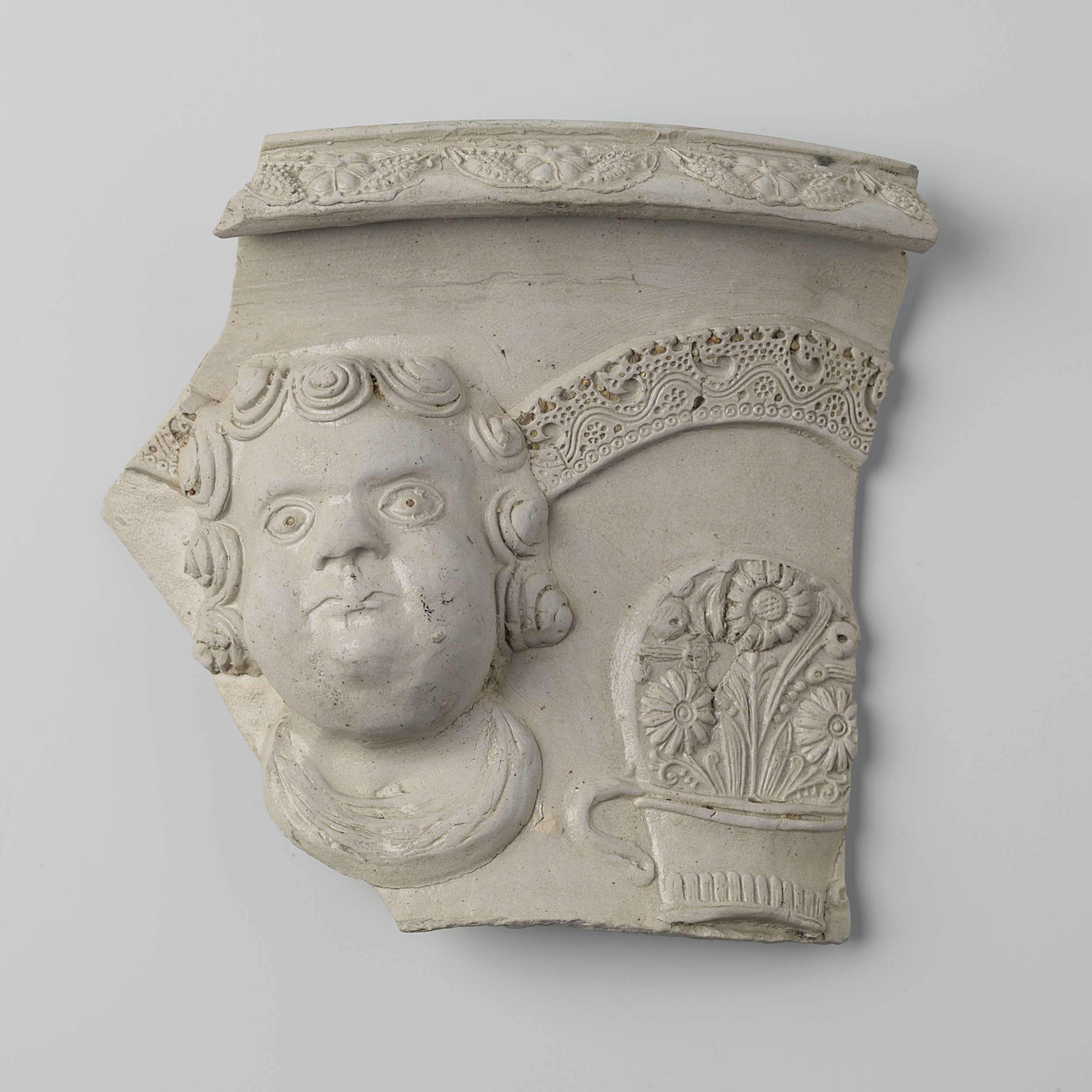 Fragment van een bloempot van steengoed. Versierd met een gedrukte en opgelegde decoratie in reliëf van een kinderhoofd of engelenkop, omgeven door decoratieve banden en een bloemenmand. Op de rand een band met druivenranken. Westerwald.