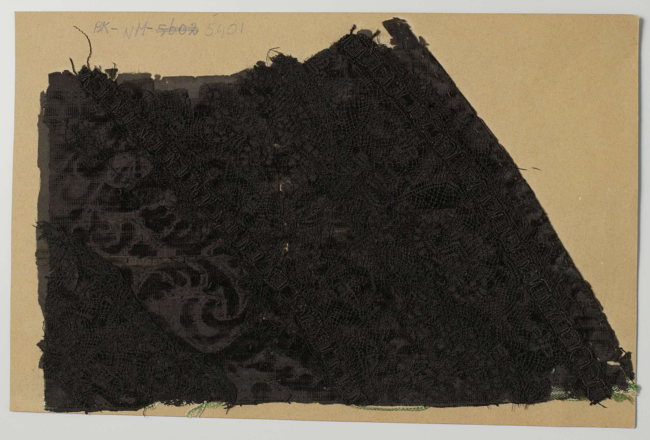 Fragment van een mantel van zwarte ciseléfluweel waarop zwarte kloskant is genaaid. Het fragment is volgens overlevering afkomstig van een mantel van Hugo de Groot.