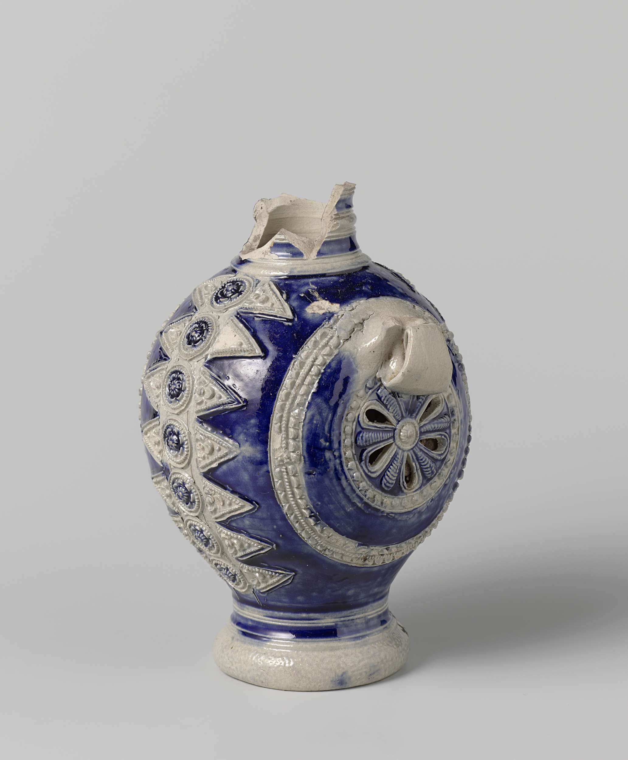 Fragment van een kan van steengoed op hoge voet met een bolvormige buik. Het oor en de nek ontbreken. Profielen op de nek en voet. Gedeeltelijk bedekt met kobaltblauw. Op beide zijden van de buik een enigszins afgeplat, dubbelwandig gedeelte met een opengewerkte rozet omgeven door twee gedrukte en opgelegde cirkels in reliëf. Één met ...