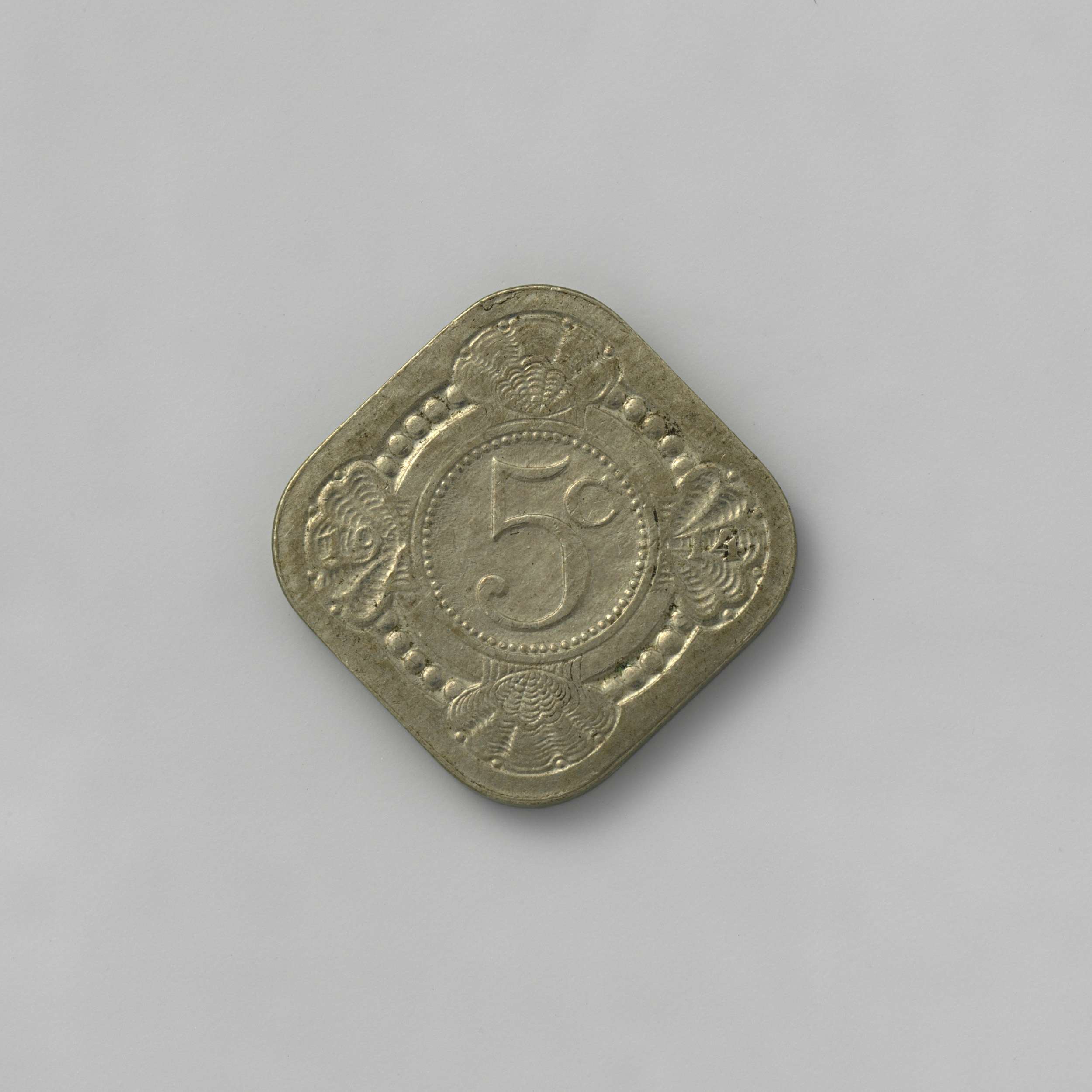Vierkante nikkelen munt. Voorzijde: in hoeken versiering, daarbinnen twee cirkels, waarin landsaanduiding. Daarbinnen vruchtdragende tak van een oranje-appel. Keerzijde: in de vier hoeken schelpen-versiering, verbonden door parels. Daarbinnen waarde-aanduiding 5 C in parelrand. Jaartal in de twee schelpen links en rechts. Gladde rand.