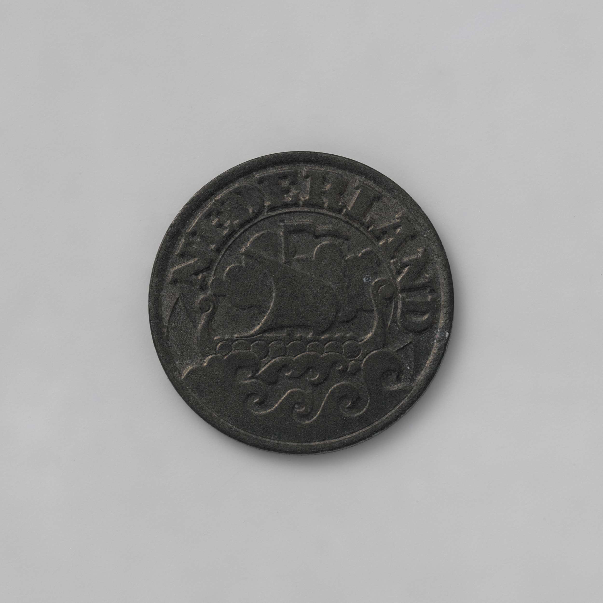 Zinken munt. Voorzijde: zeilschip op zee. Keerzijde: tussen twee twijgen waarde-aanduiding 25 cents, waaronder jaartal. Gladde rand.