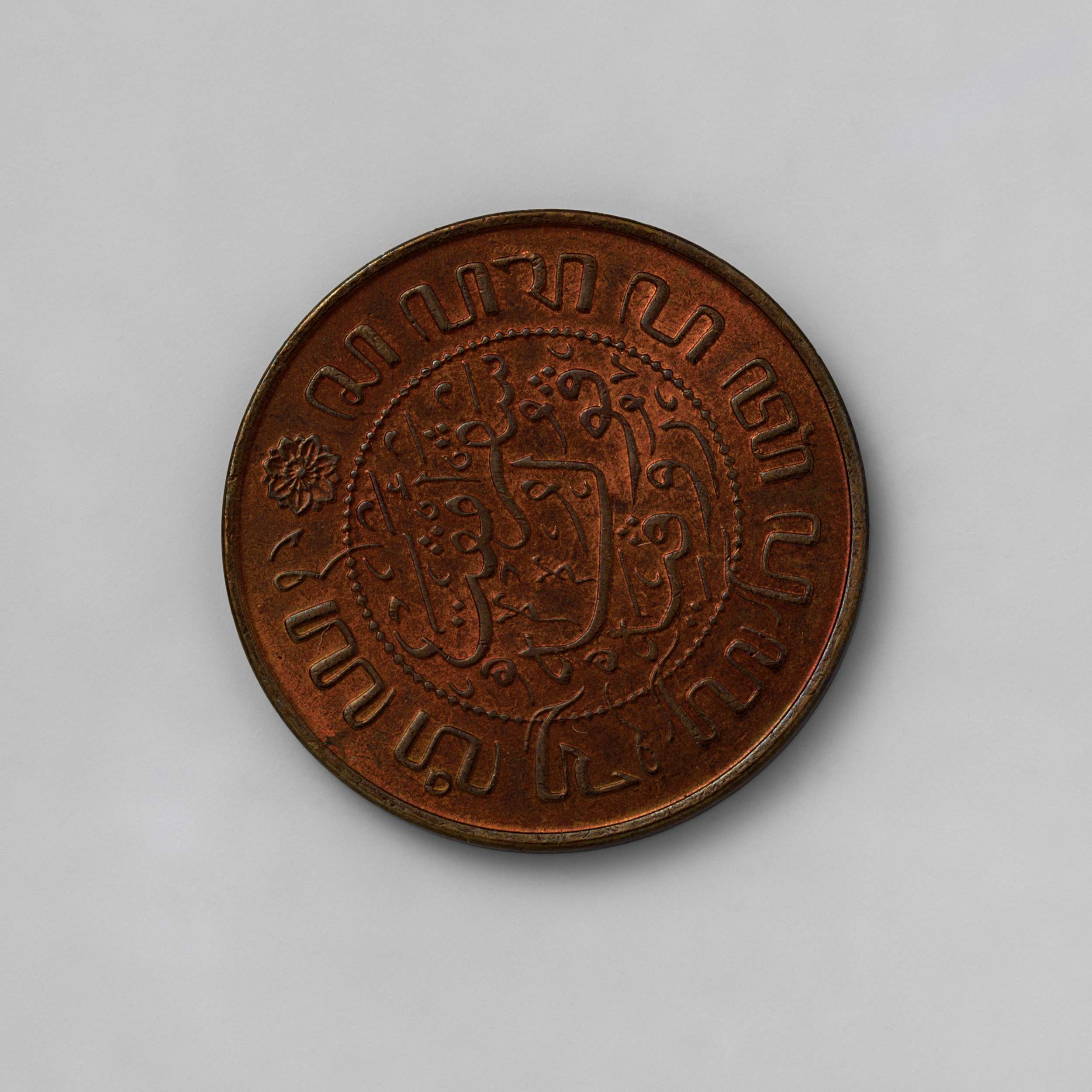 Koperen munt. Voorzijde: tussen jaartal gekroond rijkswapenschild. Boven kroon landsaanduiding en onder wapenschild waarde-aanduiding. Keerzijde: driereregelig Maleis opschrift in Arabische letter- en orthografische tekens, waaromheen omschrift in het Javaans. Gladde rand.