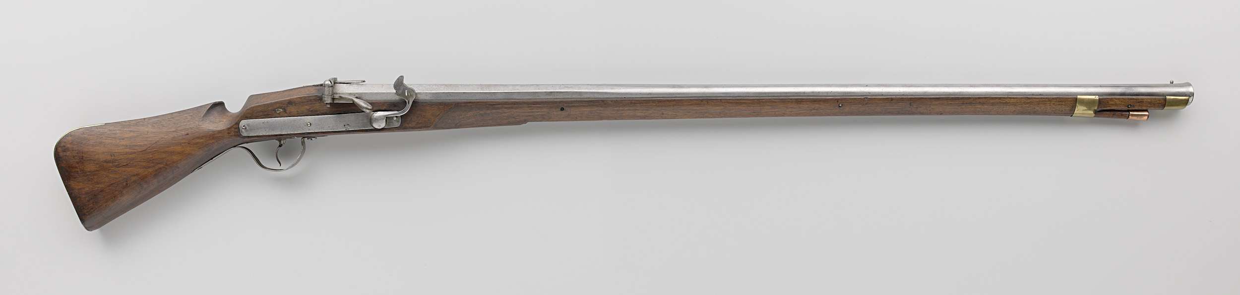 Musket met gedeeltelijk achtkantige loop (achterkant) en gedeeltelijk ronde loop. Tromp iets trechtervormig. Vizier en korrel. Lontslot. Vlakke, smalle en rechthoekige slotplaat, vastgezet met twee slotschroeven. Lade is ondersierd. Twee dichte messing ladebanden. Kolf met koperen kolfplaat. [inventarisformulier W.S. December 1986]