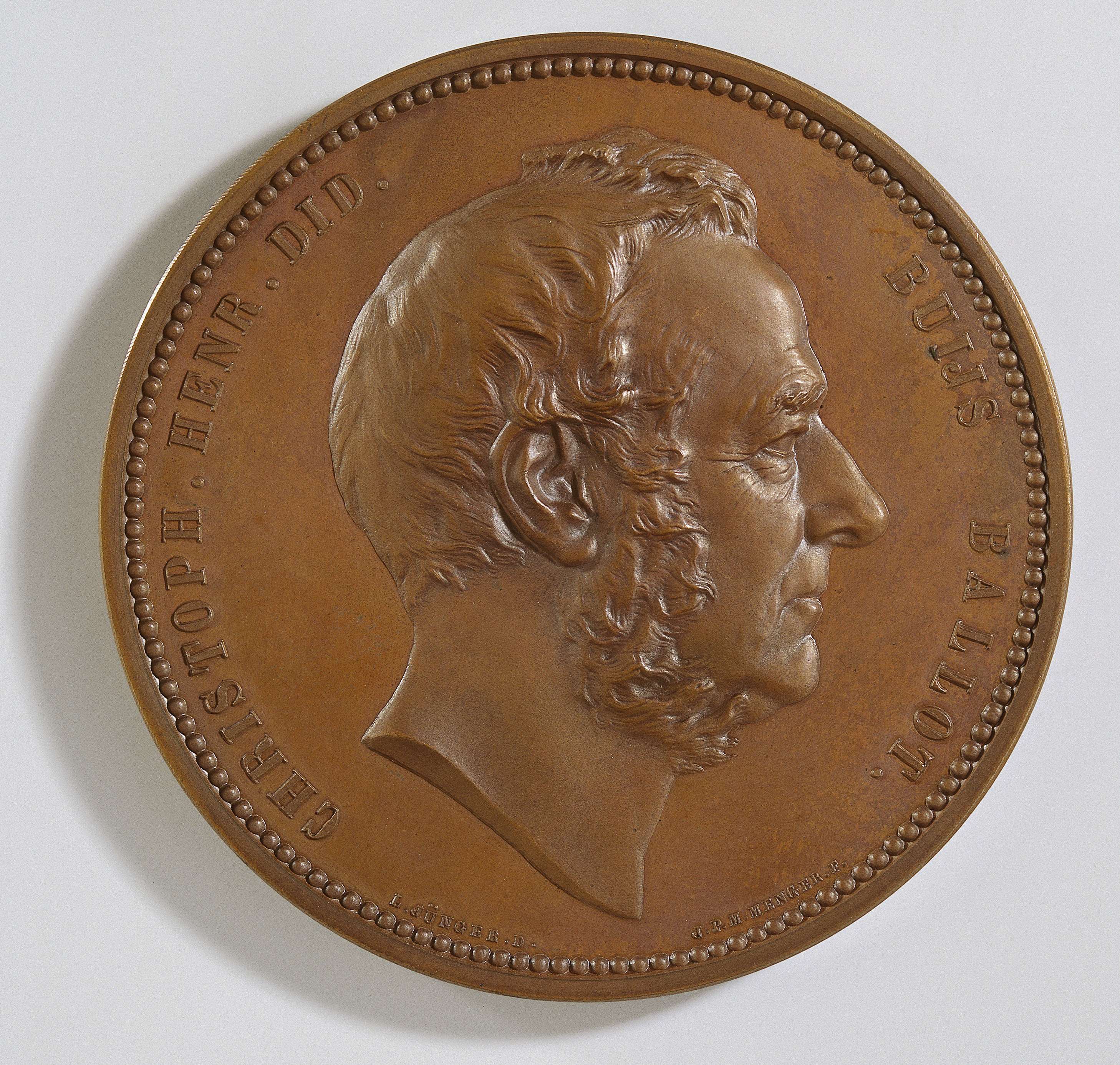 Bronzen penning in doos van Christophorus Henricus Didericus Buys Ballot, veertig jaar hoogleraar aan de universiteit van Utrecht