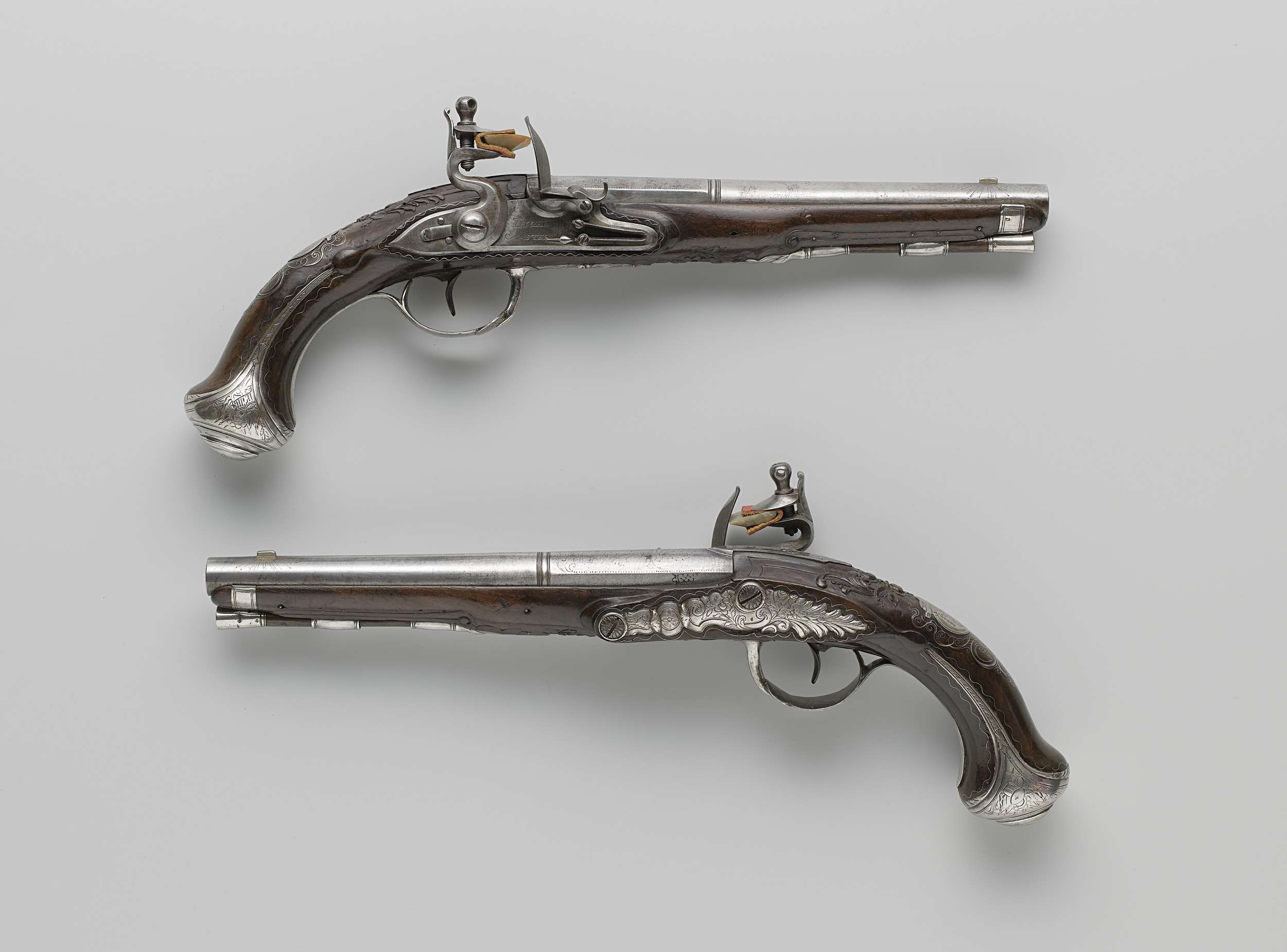 Deel van een koppel. De slotplaat draagt een signatuur. De loop is versierd met arabesken, het wapen van de familie van Hees van Berkel en twee kleine gravures, waarvan een geïncrusteerd in goud; links achterop gestempeld met het wapen van Amsterdam en onderop met een ondefiniëerbaar stempel en IR; de korrel is van zilver. De ...