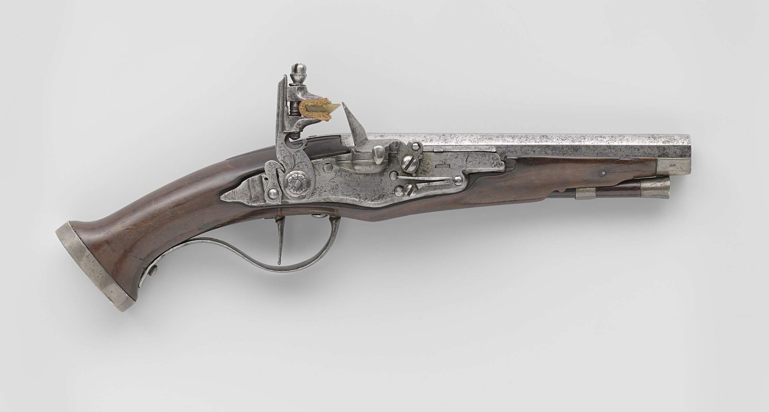 Vuursteenpistool of zakpistool. De slotplaat is gegraveerd met bladerranken, een achteroverliggende dame met een vogel en een moeilijk leesbaar signatuur; de twee pannen zijn boven elkaar gemonteerd en gescheiden door een kantelbare plaat om toegang te geven tot de laagste pan. De loop is over de hele lengte achthoekig. Behalve een ijzeren trekkerbeugel die gedeeltelijk ...
