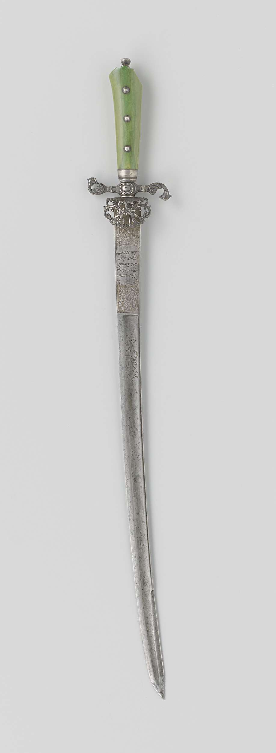 Hartsvanger of jachtzwaard genaamd. Het assymetrische gevest heeft een groen gemaakte ivoren greep in de vorm van het heft van een mes met drie sierknoppen alsof het klinknagels zijn, en is met zilver beslagen, waaronder een stootplaat, uitgezaagd en gegraveerd om op een bos krullend lofwerk te lijken en een pareerstang die aan beide zijden ...