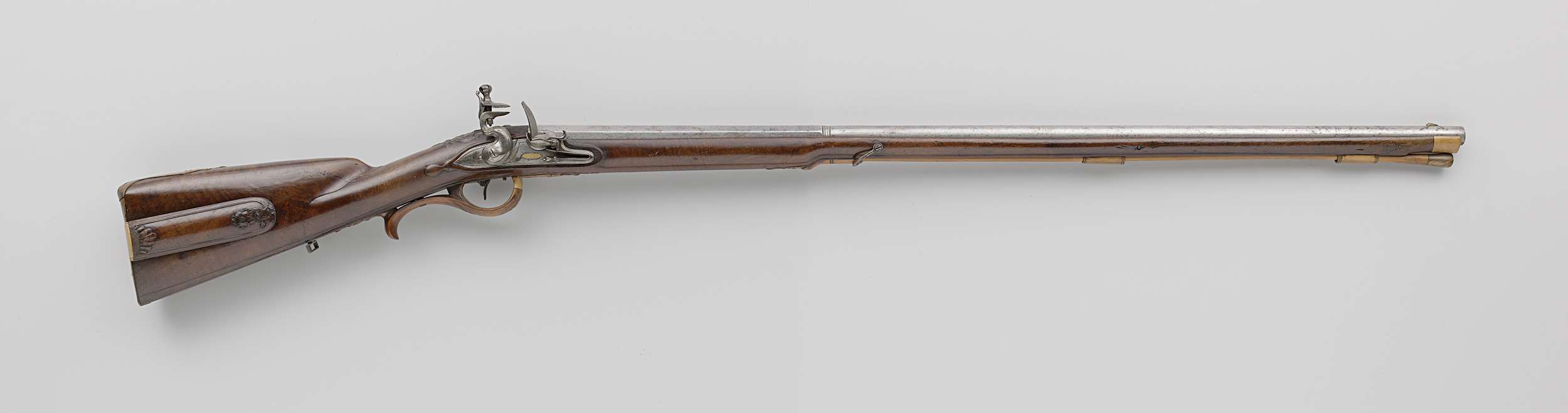 Het slot is gedeeltelijk ajour bewerkt en eenvoudig gegraveerd met onder meer lofwerk en de naam van de maker in een met goud ingelegd paneel. De loop heeft een geelkoperen vizierkorrel en een geelkoperen zundgat. De wortelnotenhouten kolf is in reliëf gesneden met rococokrullen, waaronder de wangplaat versierd met een ster van afwisselend ivoor en ...