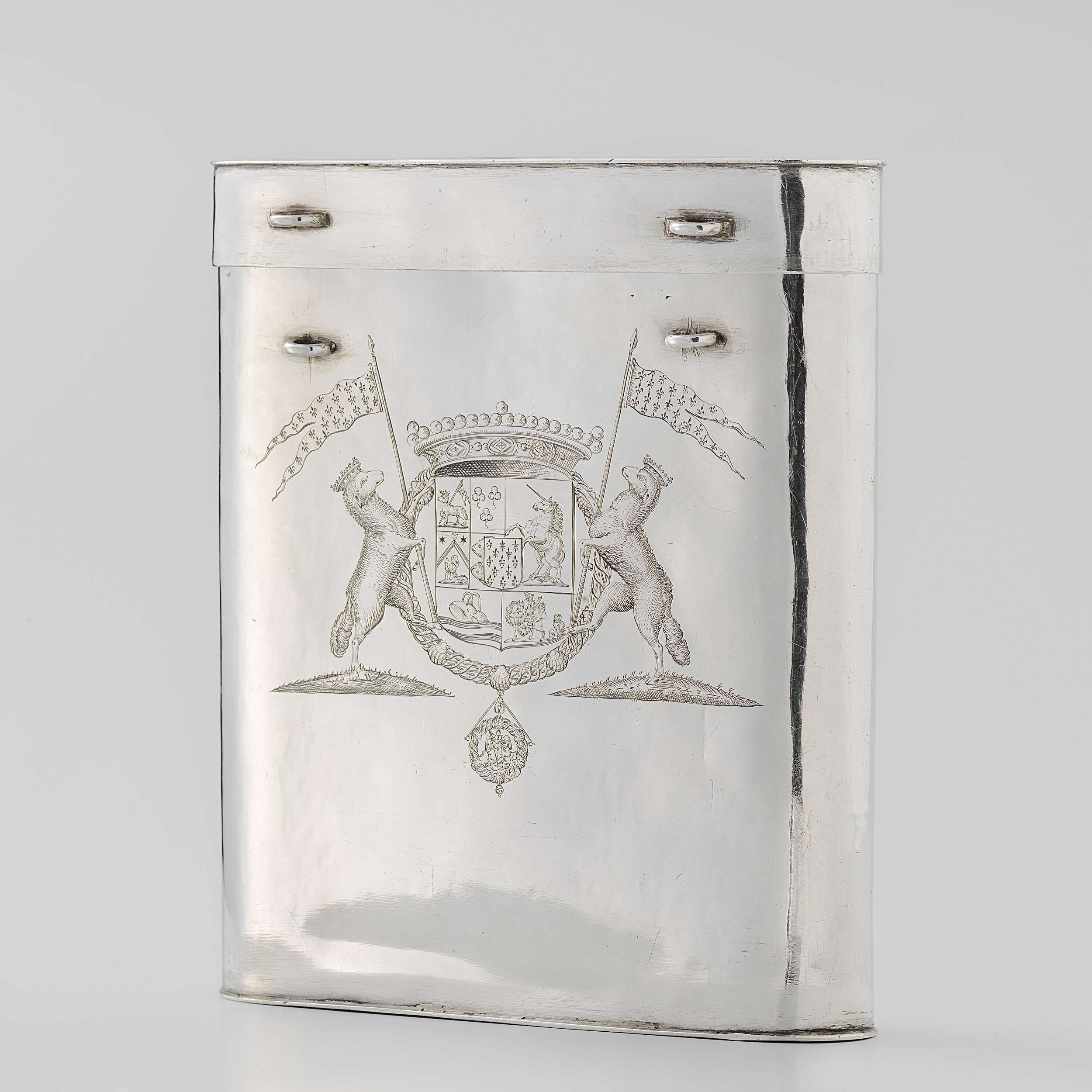 Hoge rechthoekige bus met afgeronde korte kanten, waaroverheen een deksel schuift. Op de bus aan weerskanten twee flinke ogen, waardoor men een koord kan halen om de bus te sluiten. Op één zijde de gegraveerde voorstelling van een gekroonde wapen (Cornelis Lampsins) omgeven door een keten met draagteken (Orde van St. Michel), gedragen door 2 ...