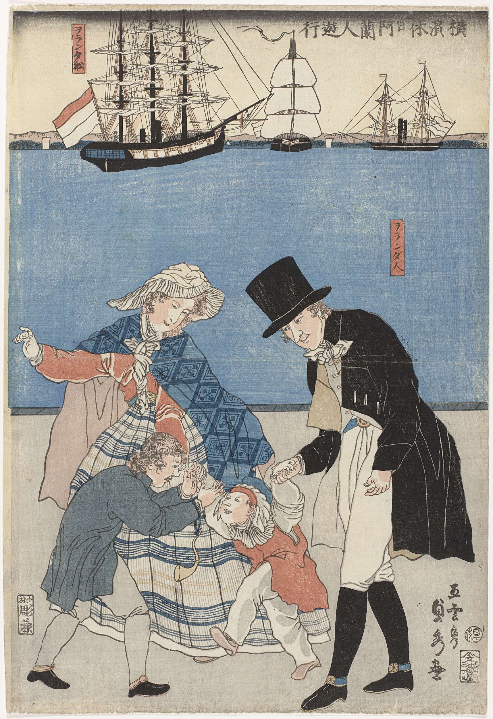 Op de voorgrond wandelt een Europees paar (Hollanders) met twee kinderen over een kade. Het oudste kind heeft een hoorn aan zijn pols hangen; het jongste kind wordt door zijn ouders bij de hand gehouden. De man draagt een hoge hoed. Op de achtergrond, aan de overzijde van het water, liggen drie schepen afgemeerd. Opschrift: ...