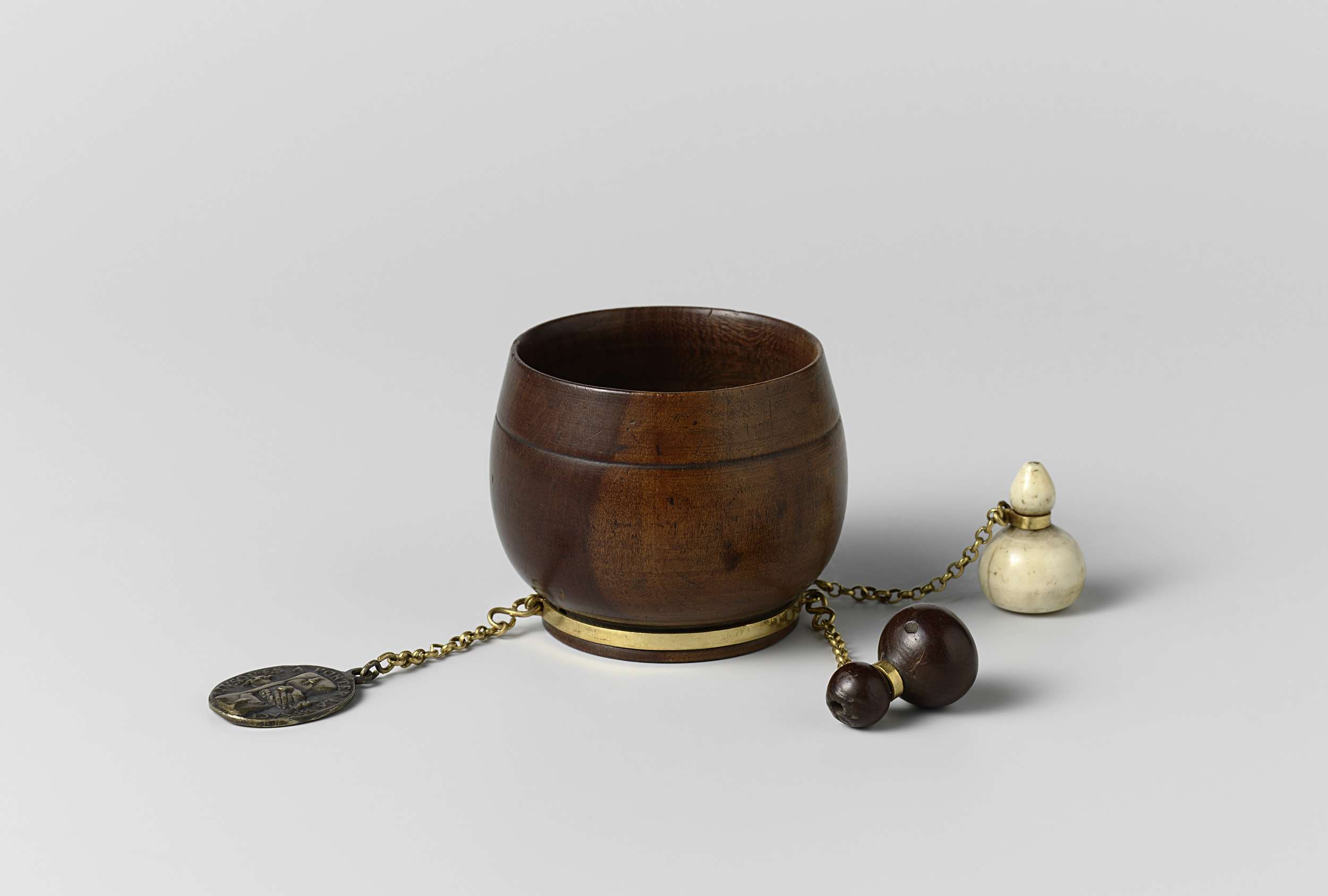 Gedraaid houten bekertje met holle voet waaromheen een gouden ring met twee draagogen. De twee uiteinden van de ring zijn doorboord en vormen een derde draagoog. Aan ieder draagoog een kettinkje, één met een houten en één met een ivoren pelgrimsflesje, aan het derde een ovale penning met draagoog. Aan de voorzijde hiervan het portret ...