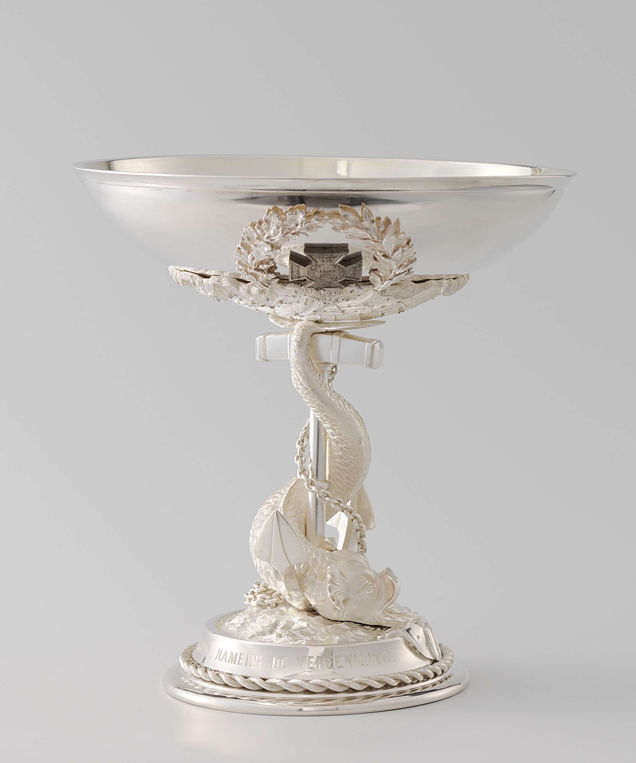 Zilveren bokaal in de vorm van een platte schaal op een schacht bestaande uit een anker, waaromheen een waterspuwende fantasie vis en de ankerketting gekronkeld. Tegen de onderkant van de schaal een Jacobsschelp en een kruis omringd door een eikentak en een tak met oranjeappeltjes. De stempelvormige voet is omsnoerd door een kabel en een ...