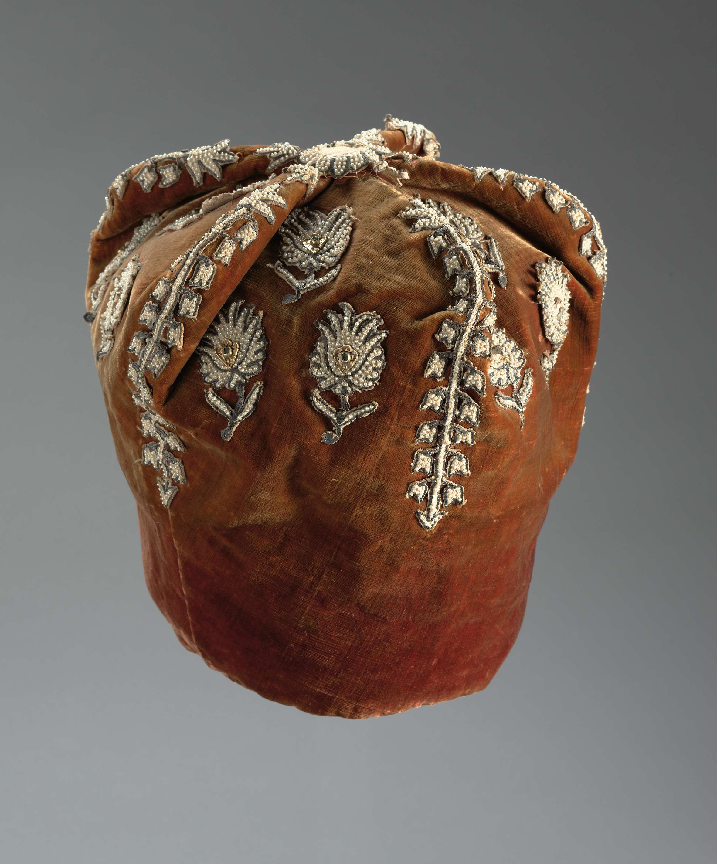 Muts dienende tot opvulling van de verdwenen hertogskroon door de koning van Spanje aan Michiel Adriaenszoon de Ruyter vereerd. Gedrukt canoptisch van vorm en vervaardigd van oranje/bruin fluweel, bezet met figuratie van bloemen en bladeren, bestaande uit parels en groene stenen. Gevouwen in vijf compartimenten, ieder met drie bloemen. Binnenwerk grof linnen. Aan de bovenzijde ...