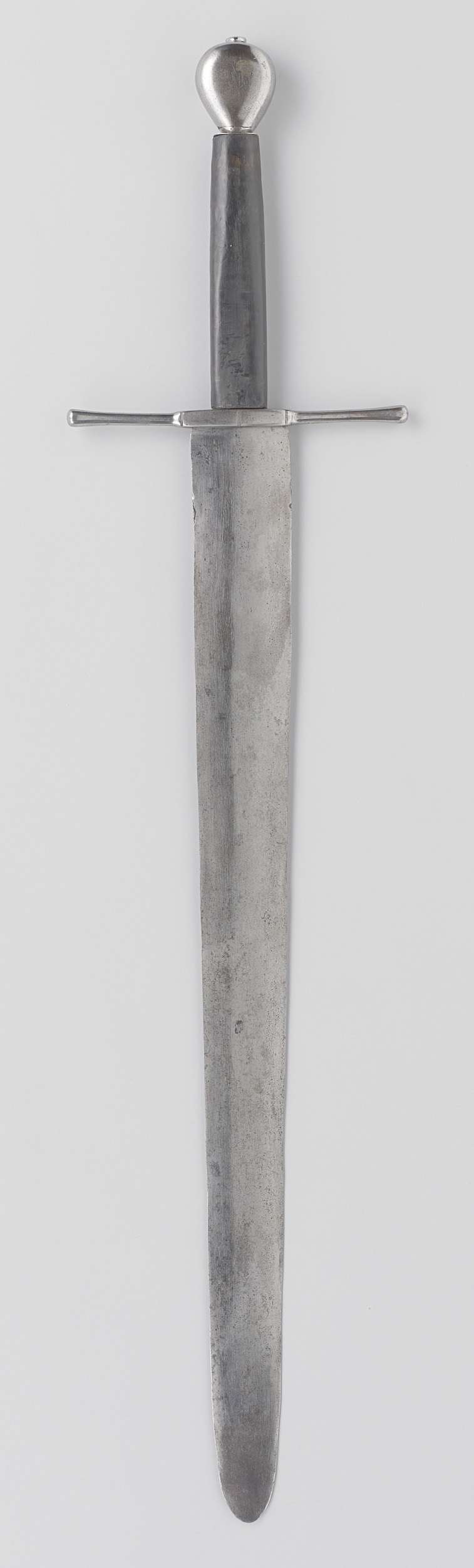Beulszwaard met leren gevest, aan beide zijden scherp snijgedeelte, bovenaan knop, onder gevest uitsteeksels. Afkomstig van het Gerechtshof, Den Haag.