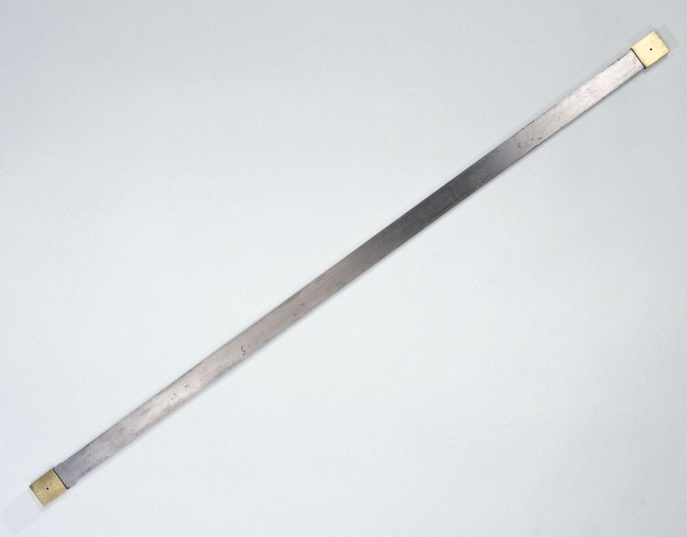IJzeren maatstok met verwijderbare koperen uiteinden. Maatindeling aan voorzijde in decimeters, van 10 tot 20; aan de keerzijde in stukken van 33.3 cm, van 3 tot 6. Voorzijde opschrift: METRES. Keerzijde: SE en signatuur: BARADELLE A PARIS.