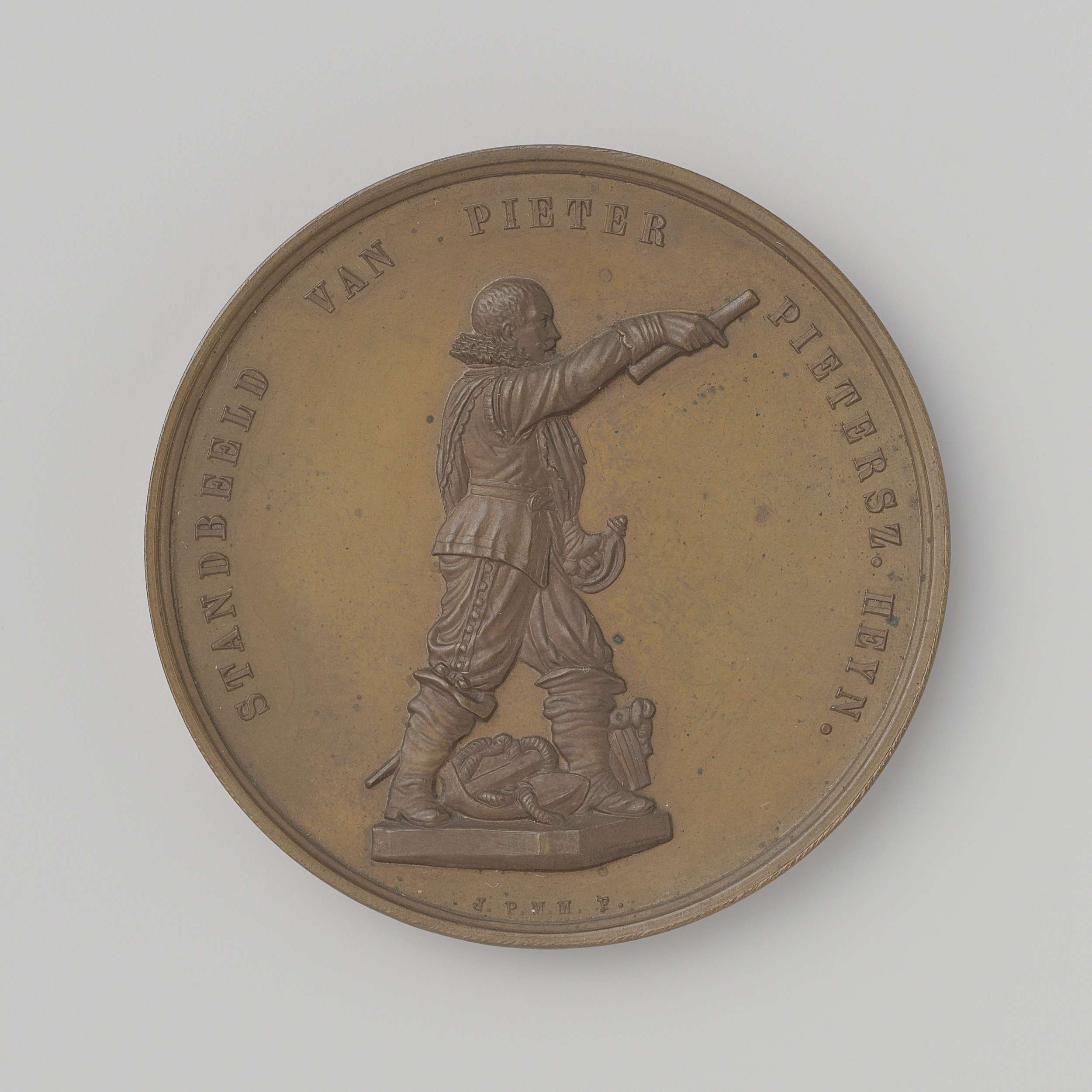 Bronzen penning. Voorzijde: standbeeld man met commandostaf in uitgestrekte rechterhand binnen omschrift. Keerzijde: opschrift binnen eikekrans