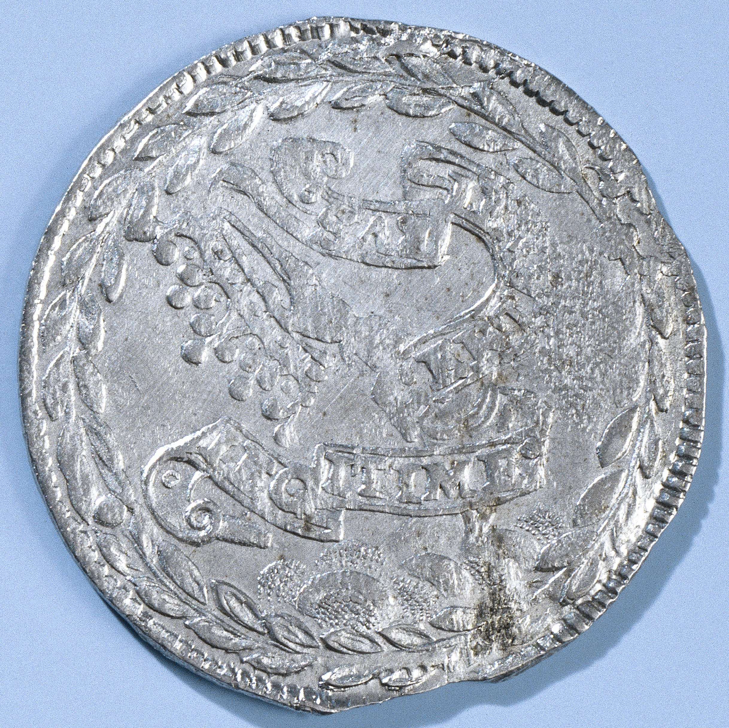 Zilveren penning. Voorzijde: hand met een kroon, omwonden met wimpel met opschrift. Keerzijde: opschrift.