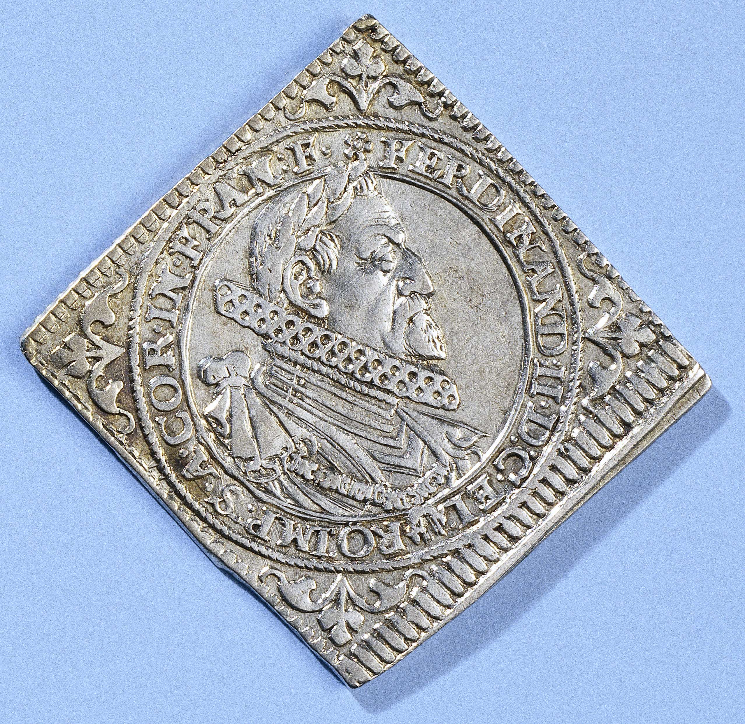 Ruitvormige zilveren penning. Voorzijde: borststuk man. Keerzijde: kroon met aan beide zijde een hand en er onder nog een kroon.