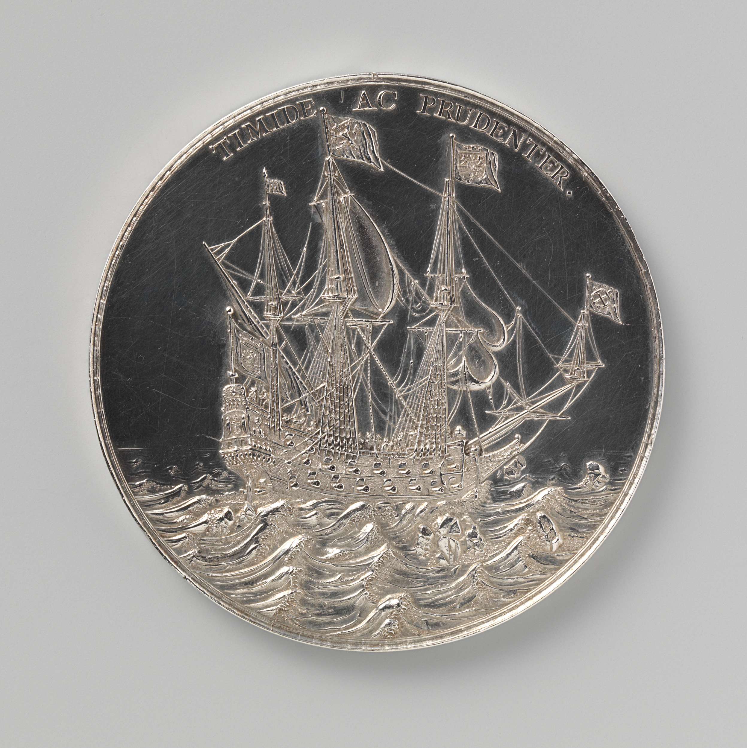 Zilveren penning. Voorzijde: oorlogsschip op open zee binnen omschrift. Keerzijde: opschrift binnen krans van bloemen en vruchten.