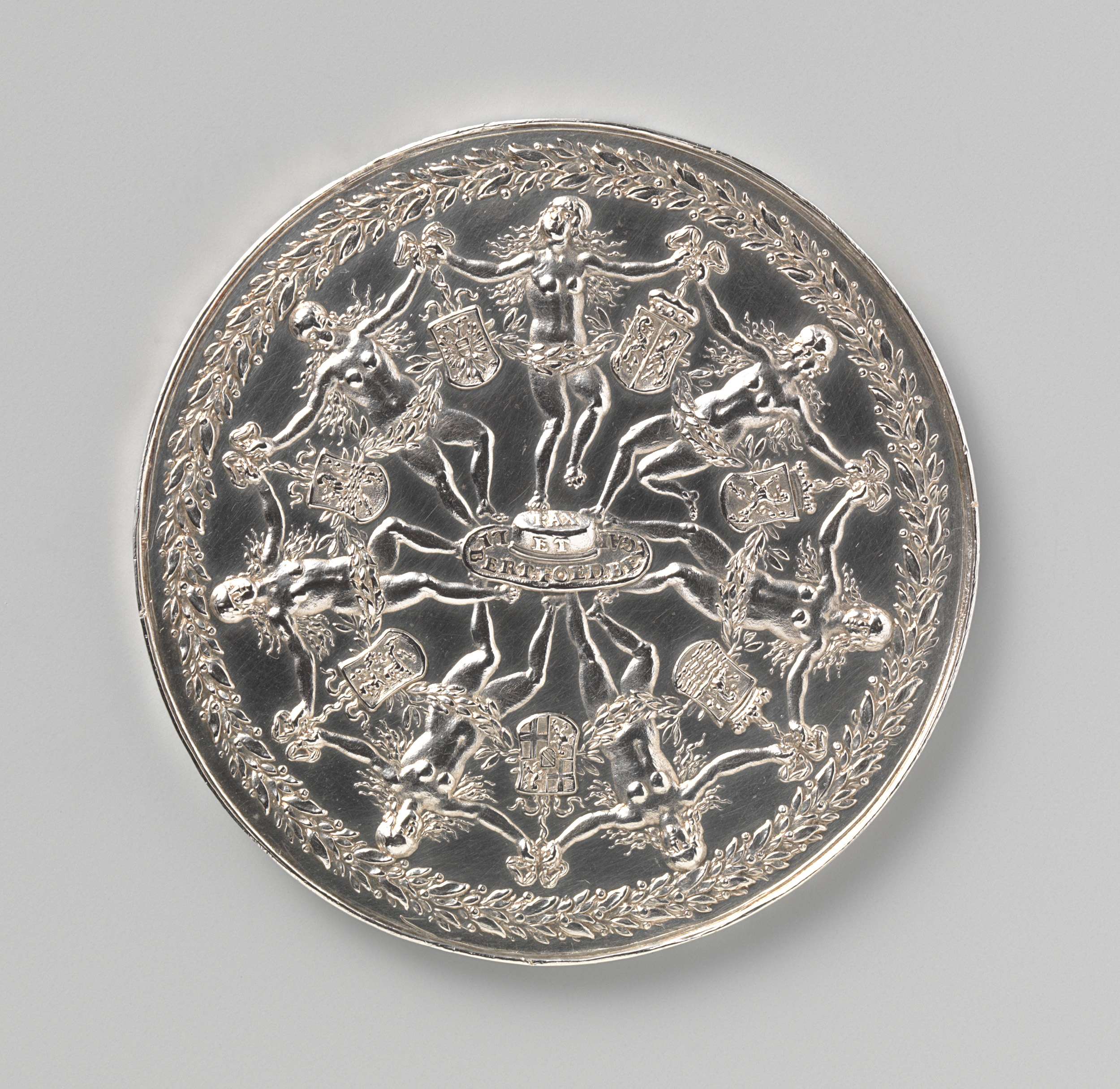 Zilveren penning. Voorzijde: zeven vrouwenfiguren met wapenschild dansen om hoed met opschrift binnen lauwerkrans. Keerzijde: opschrift binnen lauwerkrans.