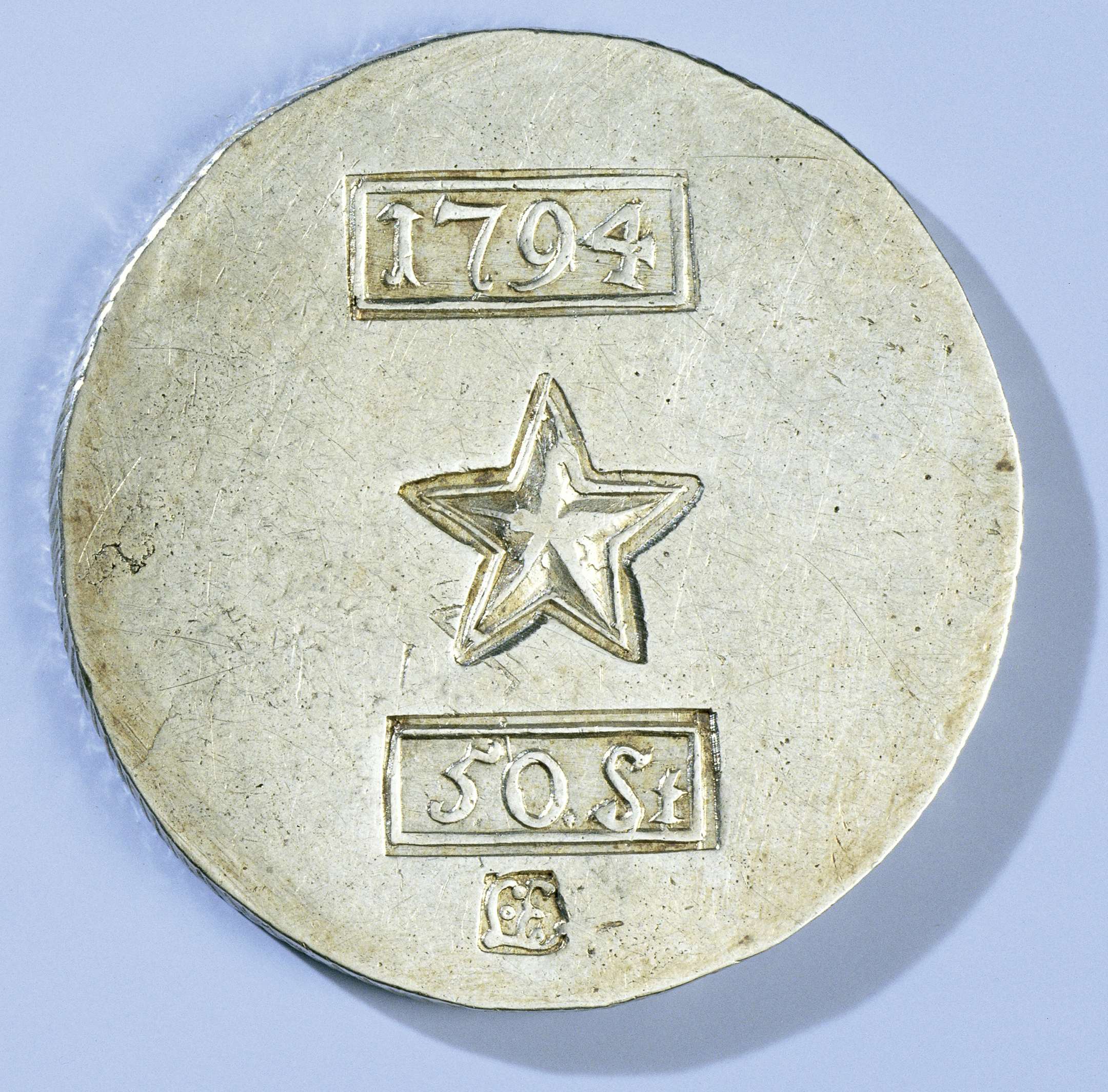 Noodmunt van vijftig stuivers van het beleg van Maastricht door de Fransen. Vervaardigd uit het zilver van de St. Servaas- en O.L. Vrouwe-kapittels. Voorzijde: vier stempels boven elkaar; rechthoekige stempel met jaartal; vijfpuntige ster; rechthoekige stempel met waardeaanduiding en kleine stempel met monogram van letters L en E. Keerzijde: blanco.