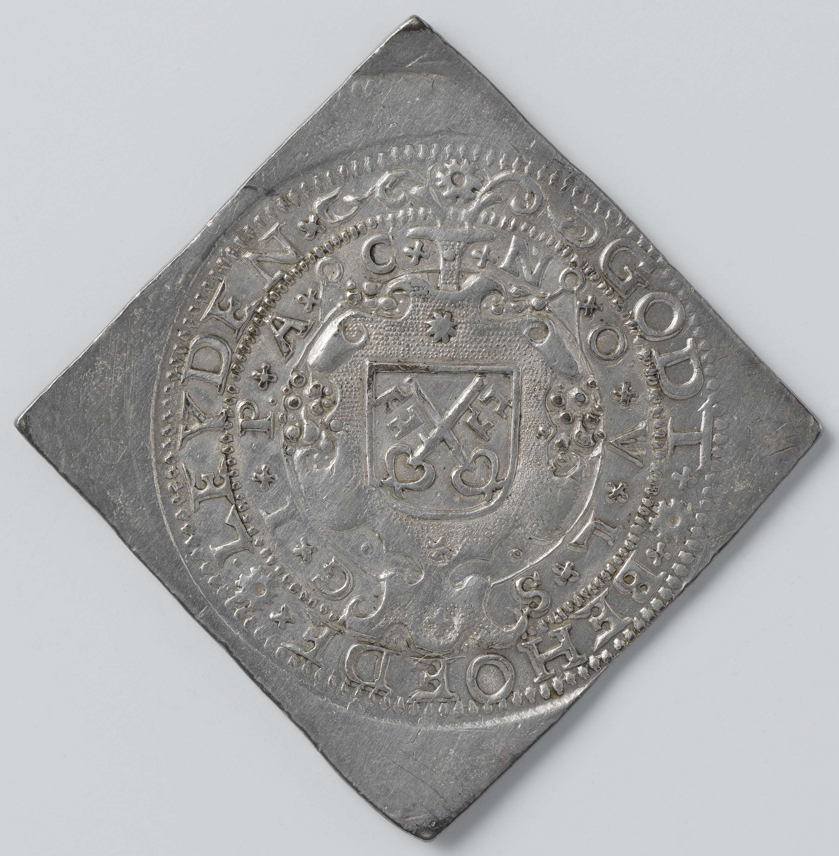 Achtentwintig stuiver; noodmunt uit Leiden, geslagen tijdens het beleg, vervaardigd uit zilver afkomstig van kerken en kloosters