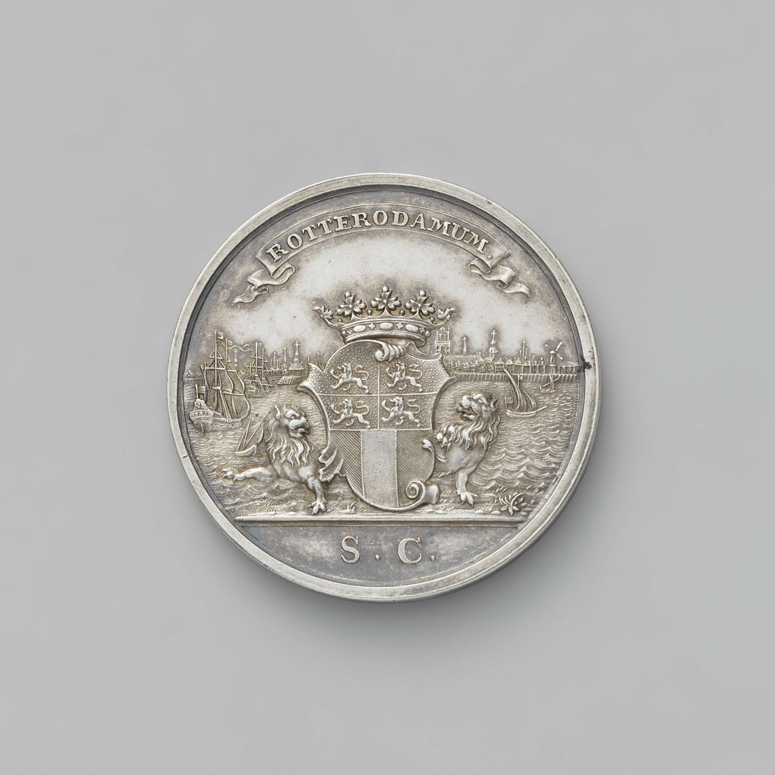 Zilveren penning. Voorzijde: gekroonde vrouw met vrijheidshoed op speer, zittend op pak temidden van drie pakken en vat; rechts: riviergod met uitgestrekte rechterhand, zittend bij waterkruik; links: zwevende Mercurius met staf en gevulde hoorn van overvloed binnen omschrift; afsnede: opschrift. Keerzijde: gezicht op stad aan Maas, waarop vijf schepen varen onder wimpel met opschrift; op ...