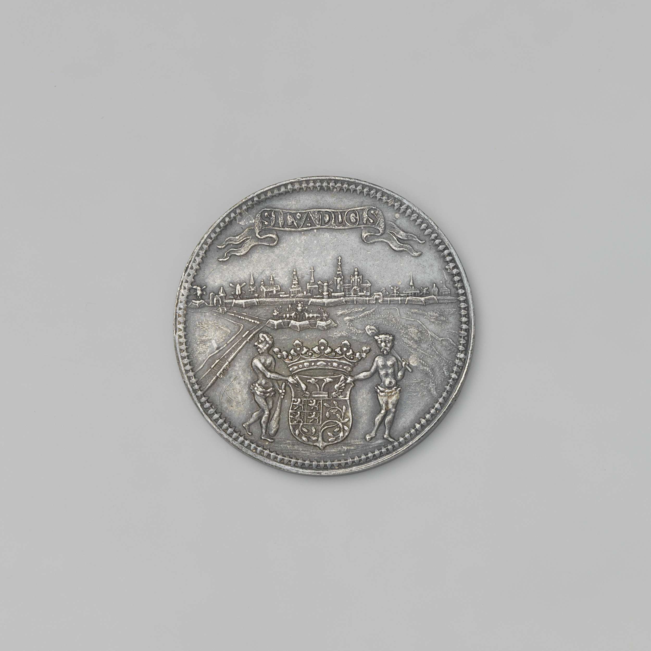 Zilveren penning. Voorzijde: gezicht op stad vanaf de zuidzijde onder wimpel met opschrift; op voorgrond: St. Antonieschans en de straatweg; daaronder gekroond wapenschild, geflankeerd door twee wildemannen met knots. Keerzijde: geopend boek op altaar, waarvan basis monogram van letters S en C draagt, beschenen door alziend oog in stralenkrans; links van altaar: Gerechtigheid, die met ...